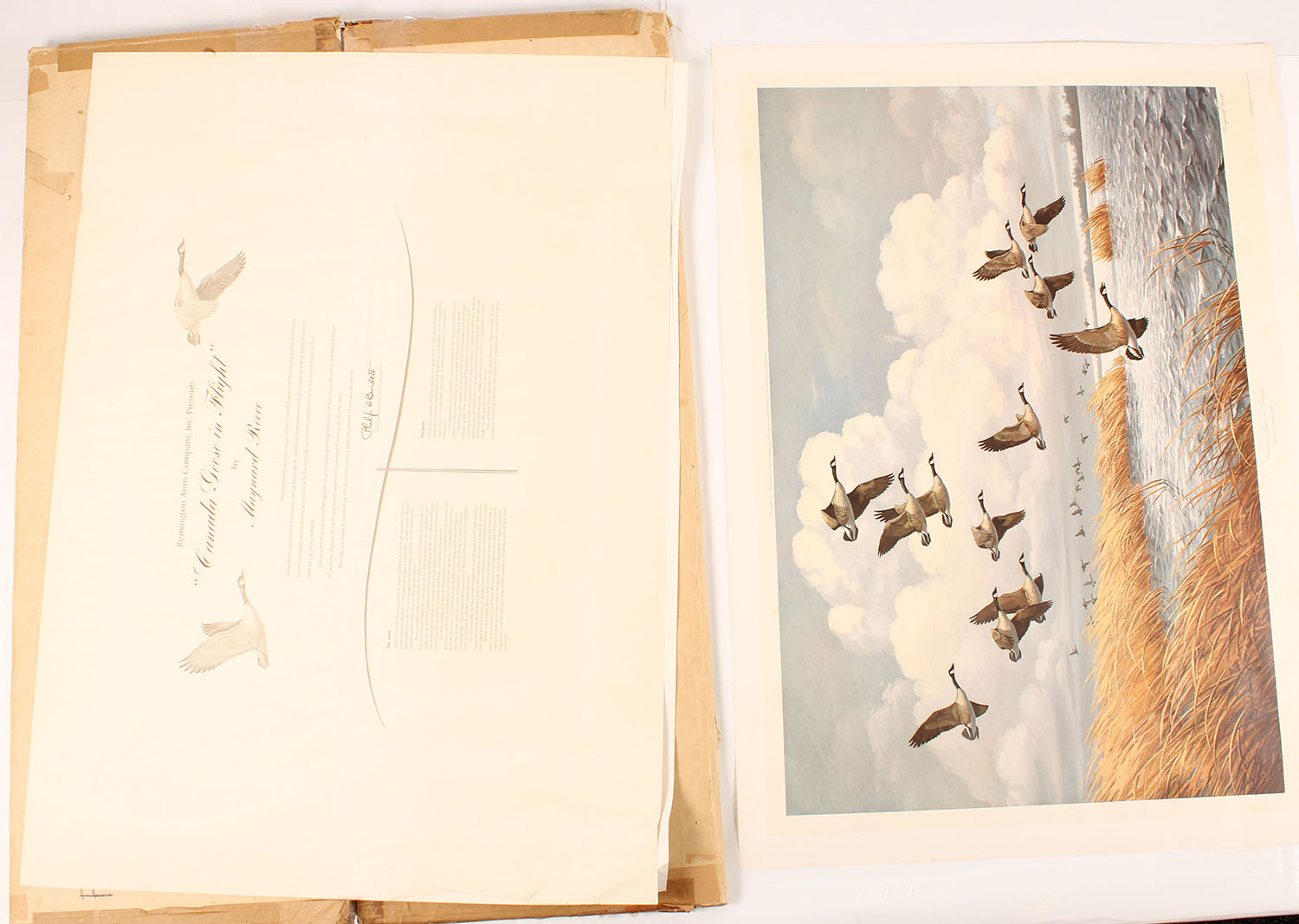 Maynard Reece print, ''CANADA GEESE IN FLIGHT'', Remington Arms Co., 35'' wide, has original shipping box & paperwork. Grade: Excellent ++ - Value: 100 to 400