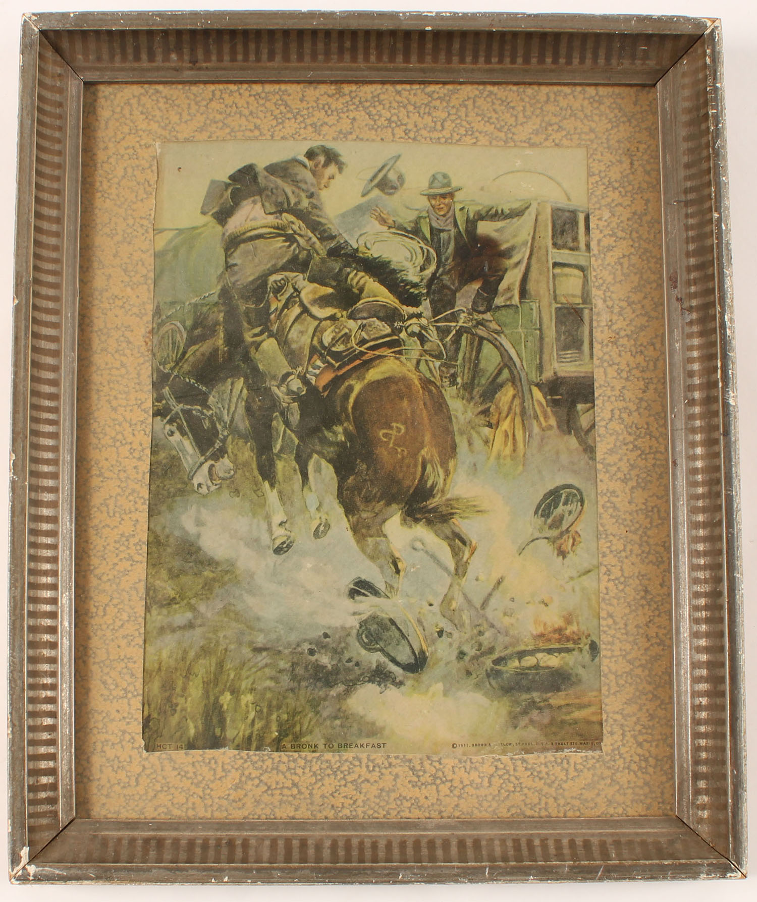 A BONK TO BREAKFAST, print, pictures a cowboy camp & a horse bucks into breakfast sending it all flying, image size, 6'' x 8'', framed. Grade: Excellent - Value: 10 to 50
