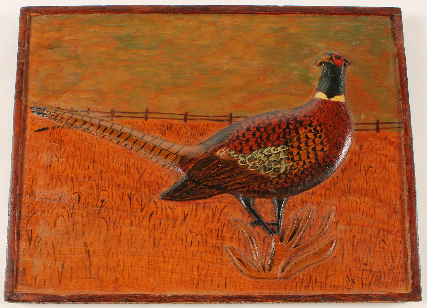 Folk Art Pheasant by unknown artist, this raised carving is hand painted, 12'' x 9''. Grade: Excellent - Value: 10 to 100