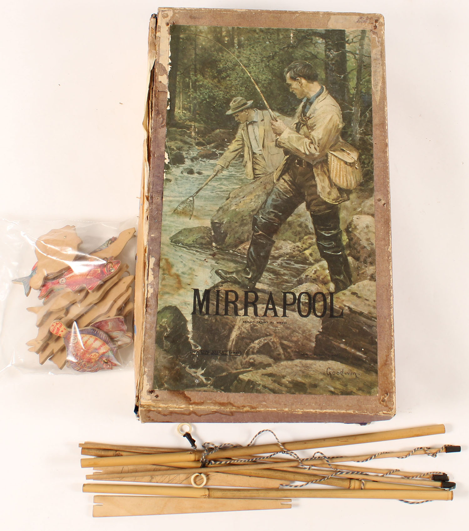 MIRRAPOOL, Chad Valley Fishing Game, This game has been in the wars a bit! The box was made to be used as a pool; the lid has a metal ''mirror'' in it, there are two wooden ''Stays'' which keep this mirror in place and then there's another folding bit of box which effectively hides the fish worth 20 points, an ell worth 4 points, other fish worth various amounts of points or an old boot, tin can or hat, at some point in its long history (it's probably from the 1930's) the lid has been torn away form the rest of the box and has buckled a bit. There are 13 items to fish for and three poles with extensions to use, all in pretty good condition. Grade: Very Good - Value: 20 to 100