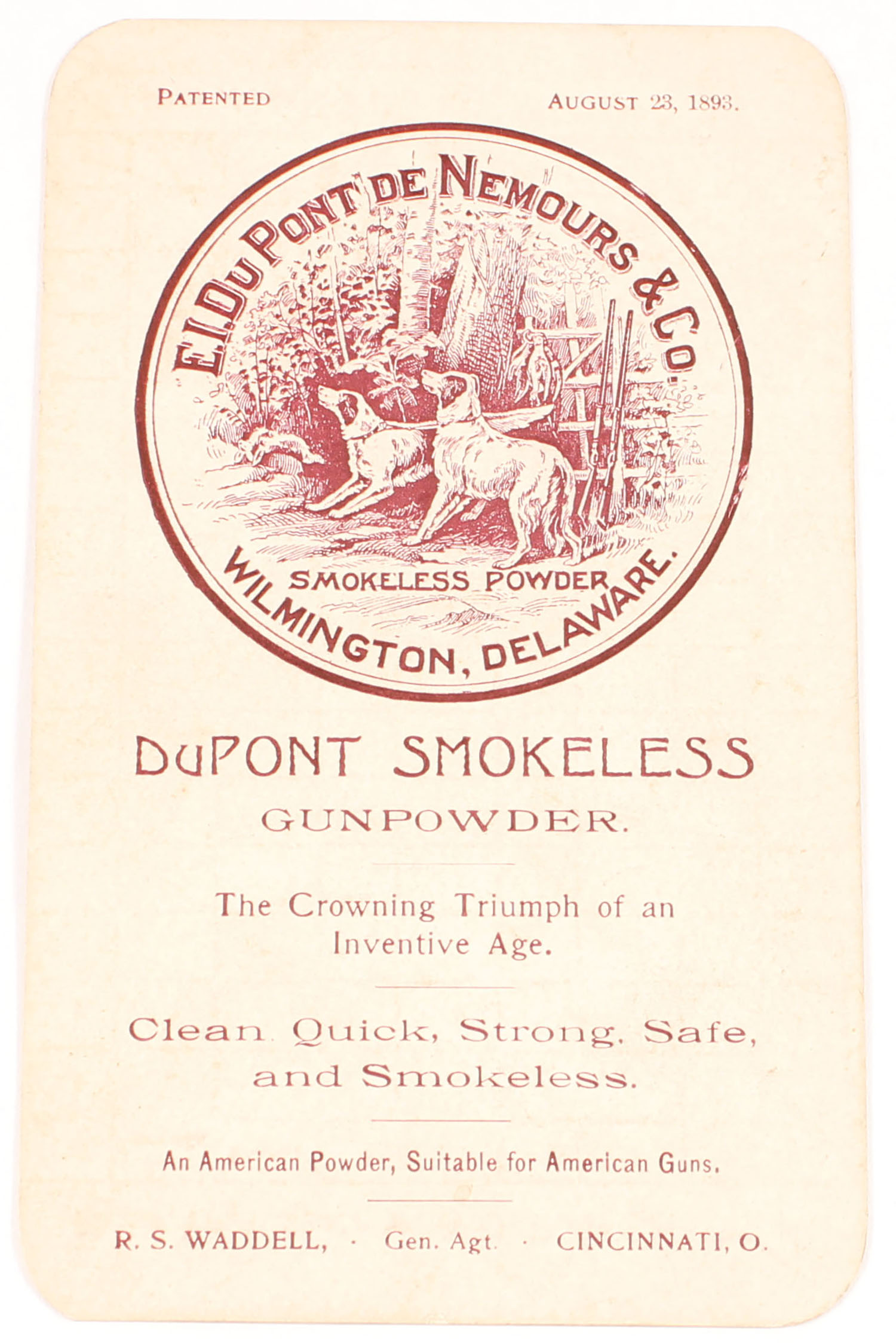 1893 E.I. DuPont de Nemours & Co. Score Card, unused, has image of powder can logo with two dogs, very nice condition, 3'' x 5 1/2''. Grade: Excellent - Value: 30 to 100