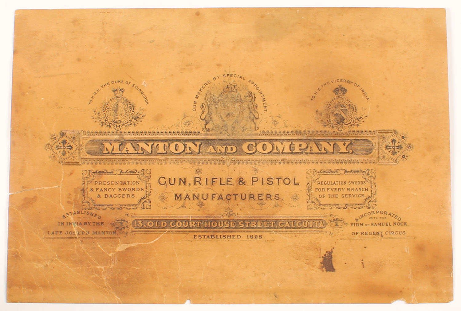 Manton and Company label for inside of a set of dueling pistols, circa 1790's. Grade: Very Good - Value: 10 to 60