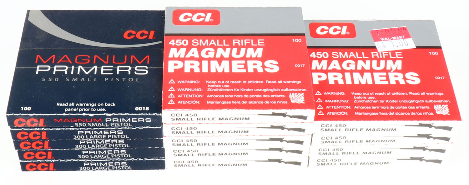 Lot of 14 CCI large pistol and small rifle Primers, FULL. Grade: Excellent ++ - Value: 40 to 80