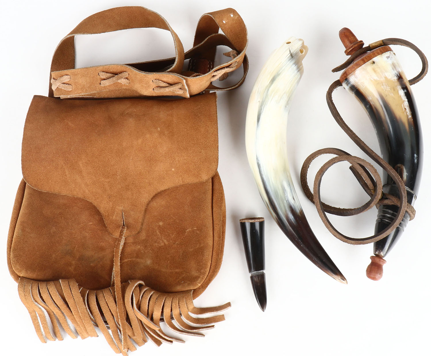 Set of 2 powder horns in leather sachel, both solid, unmarked. Grade: Excellent - Value: 20 to 60