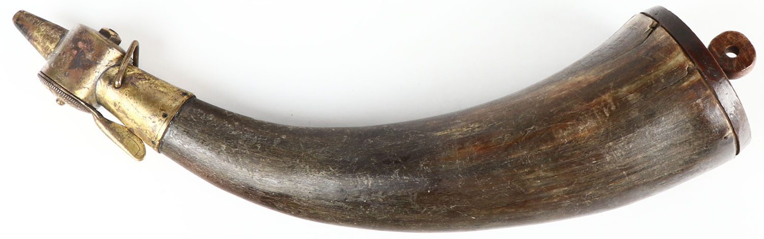 Harold A. McCallum(1911-2003 who is a famous collector of Winchesters an a muzzleloaer shooter from Monroe, ORE.), powder horn, with a brass tip identical to the Burnham flasks, crack to horn . Grade: Very Good + - Value: 50 to 250