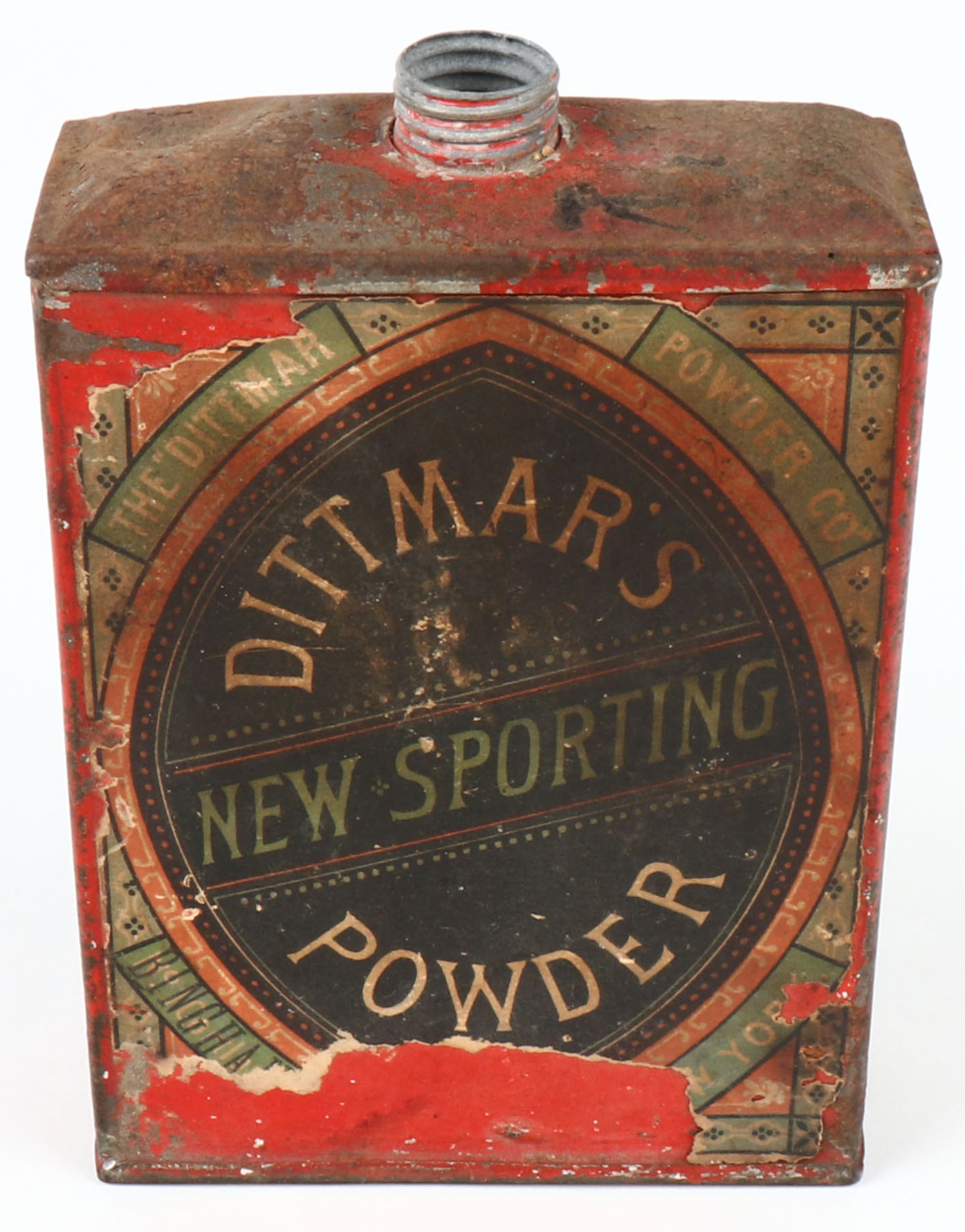 Antique powder tin, no cap, Ditmars new Sporting Powder, circa 1880s, has age soiling and damage to label. Grade: Very Good - Value: 20 to 60