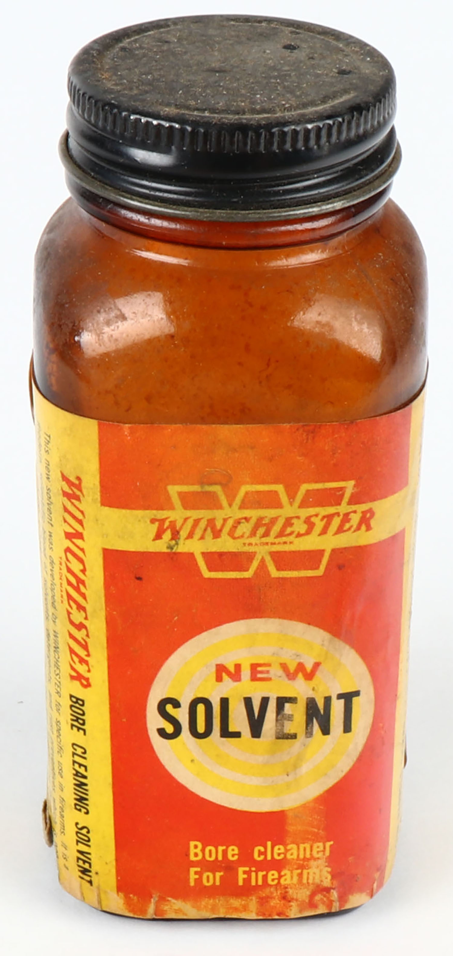 Winchester New Solvent, glass jar, Empty, solid with some scuffing. Grade: Very Good ++ - Value: 20 to 60