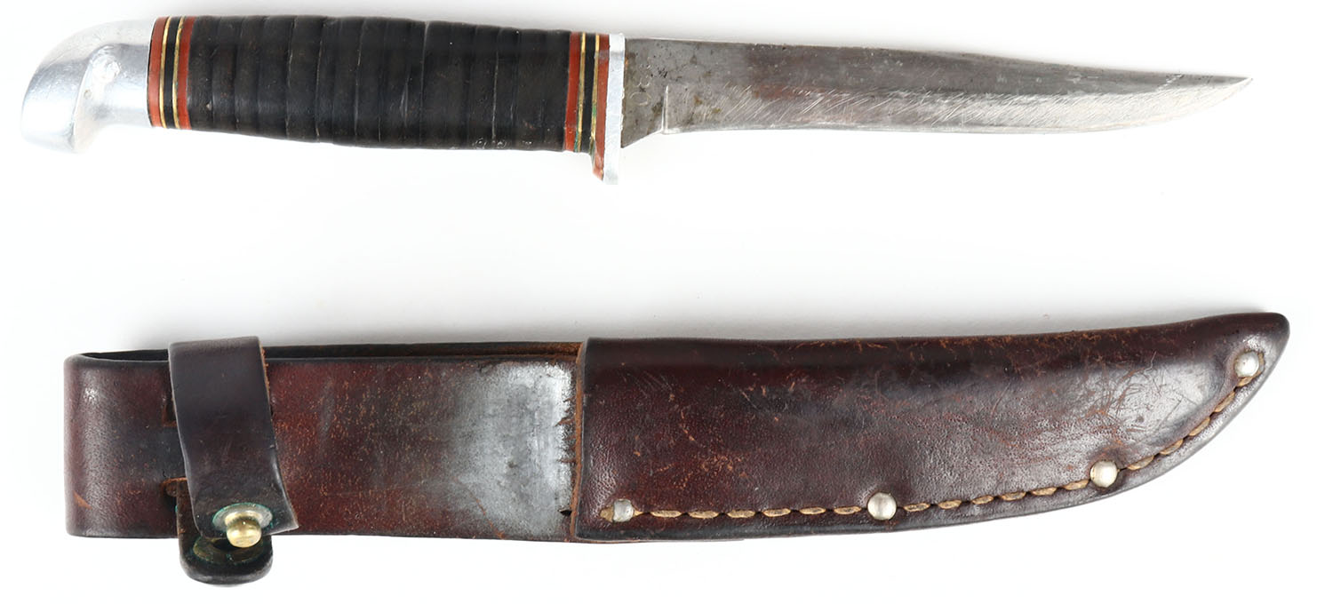 Kinfolks knife, has some rust to blade, has leather sheath. Grade: Very Good + - Value: 10 to 50