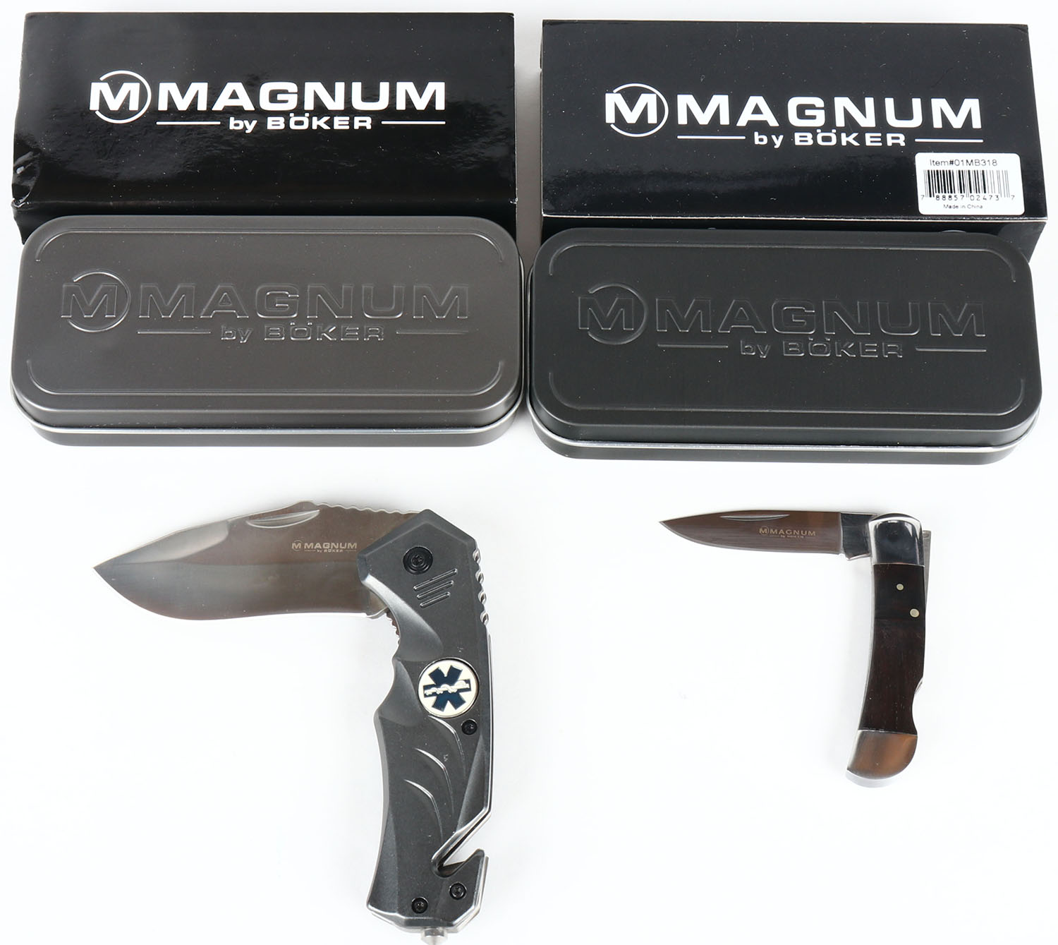 Lot of 2 Boker Magnum folding knives, in box. Grade: Excellent ++ - Value: 10 to 90