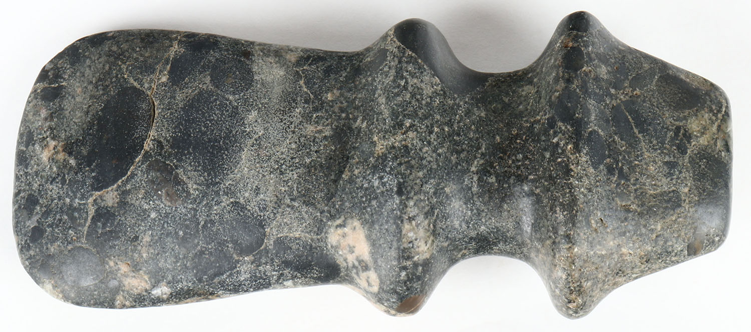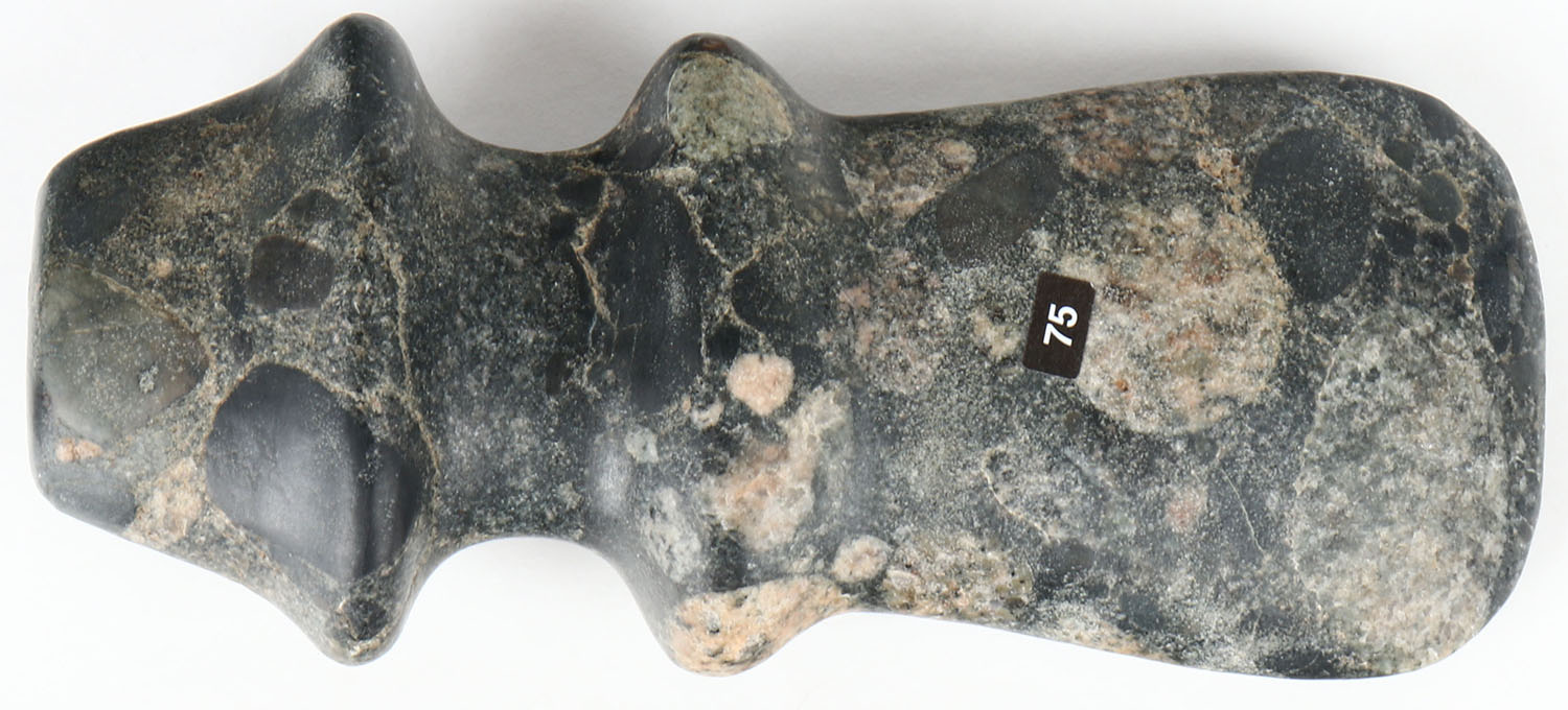 Extremely hard to find Native Indian ceremonial hard stone ax with colorful inclusions, most likely a mound piece, measures 7 1/2'' x 3 1/2''. Grade: Very Good - Value: 200 to 900