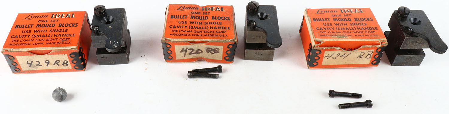 Lot of 3 Lyman Ideal bullet mould block in orignal boxes, .420, .424 and .429 cal round ball moulds. Grade: Excellent - Value: 30 to 60