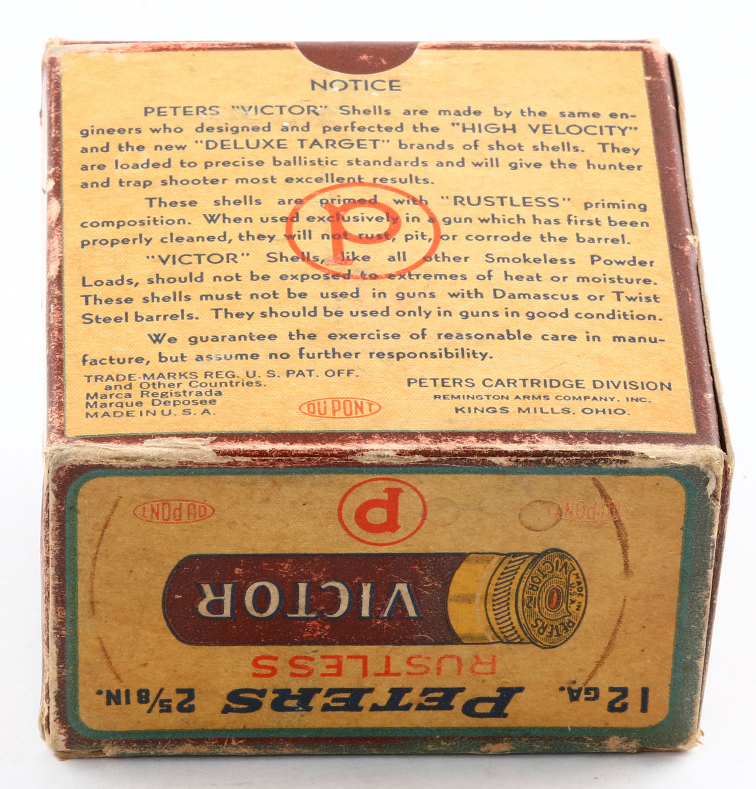 Peters, Victor, 12ga, 1pc., Full, shot size 6 Ch., Maroon, cream & orange box, 2 5/8'', box has edge wear & age soiling, paper shells are minty. Grade: Very Good + - Value: 20 to 60