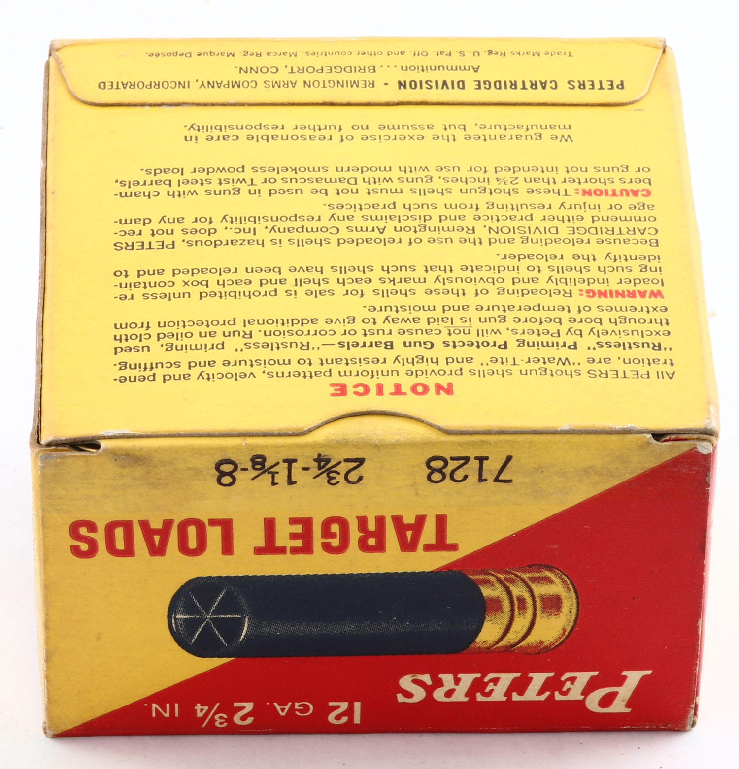 Peters, TARGET LOADS, 12ga., 1pc., Full, shot size 8, red, blue & yellow box, box has minor scuffing with excellent colors, paper shells are excellent. Grade: Excellent - Value: 10 to 30