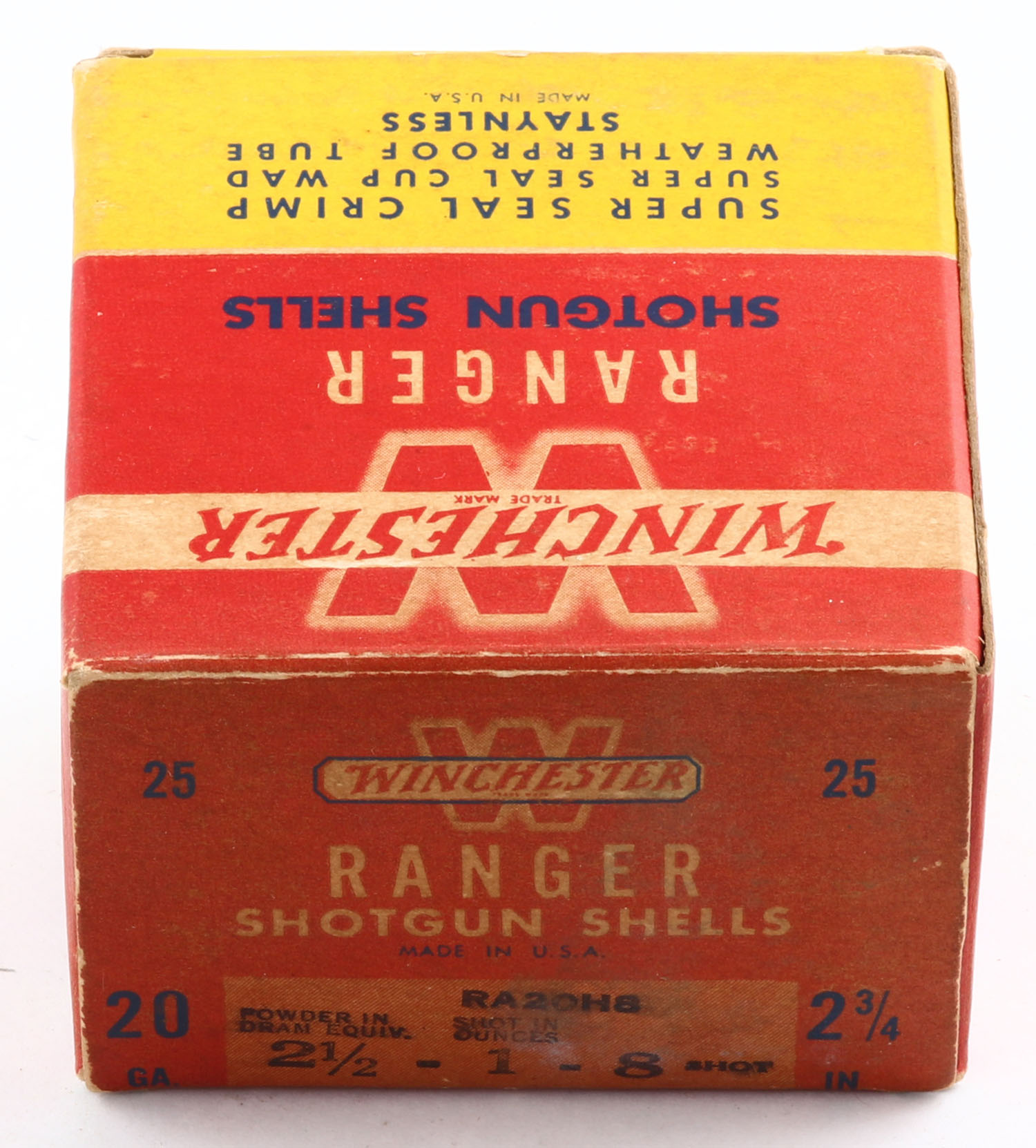 Winchester, Ranger, 20ga, 2 3/4'', Full, shot size 8, Red, white & yellow box, box has very minor age soiling, paper shells are excellent. Grade: Very Good ++ - Value: 10 to 40