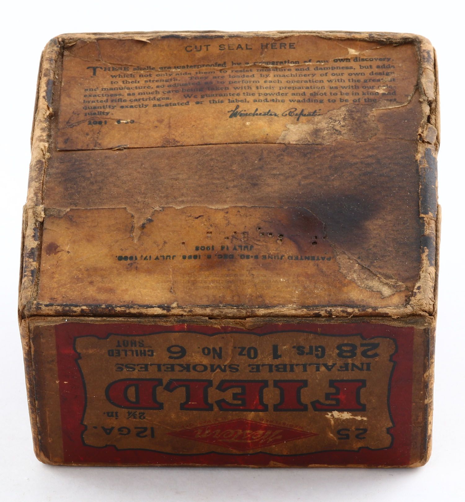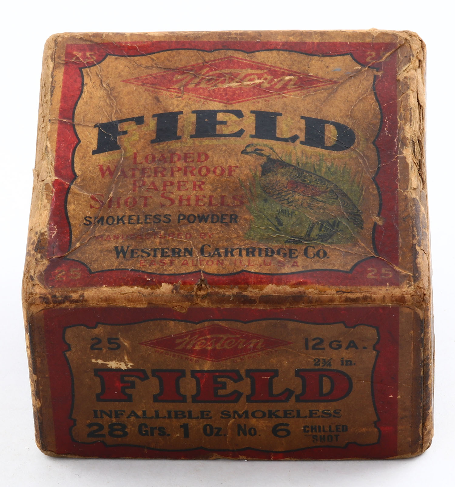 Western, Field, 12ga., 2pc., Empty, shot size 6 CH, box has soiling, edge wear, scuffing & a seam split. Grade: Poor - Value: 40 to 200