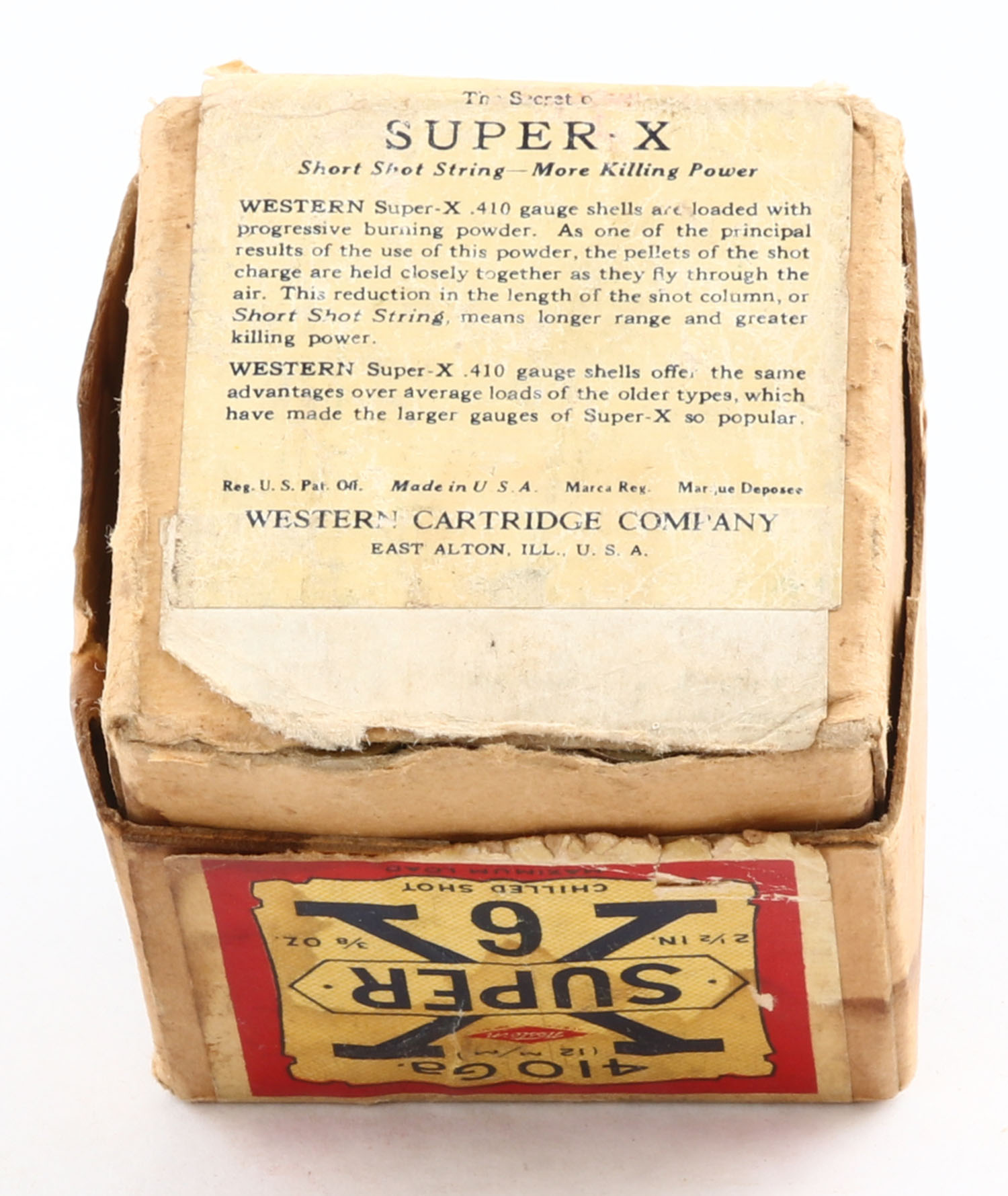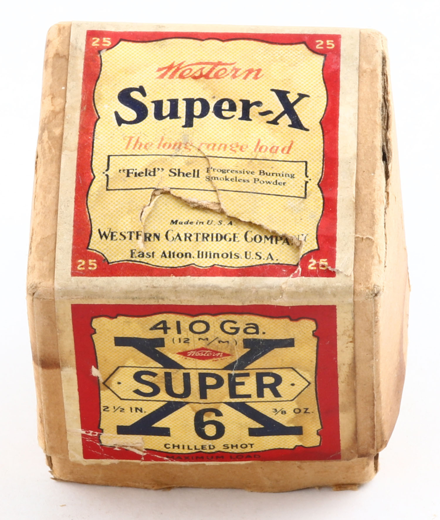 Western, Super-X, 410ga., 2pc, Full, shot size 6 Chilled Shot, 2 1/2'', box has seam splits & scuffing with edge wear, has a partial tear to top, paper shells are very good. Grade: Good ++ - Value: 40 to 100