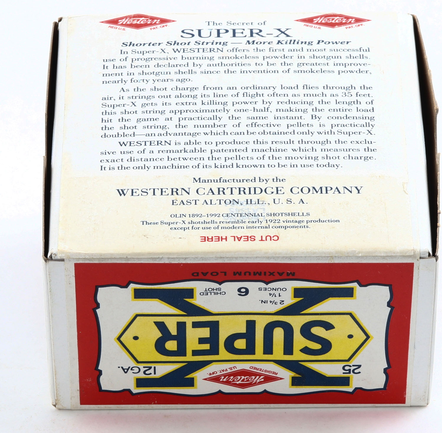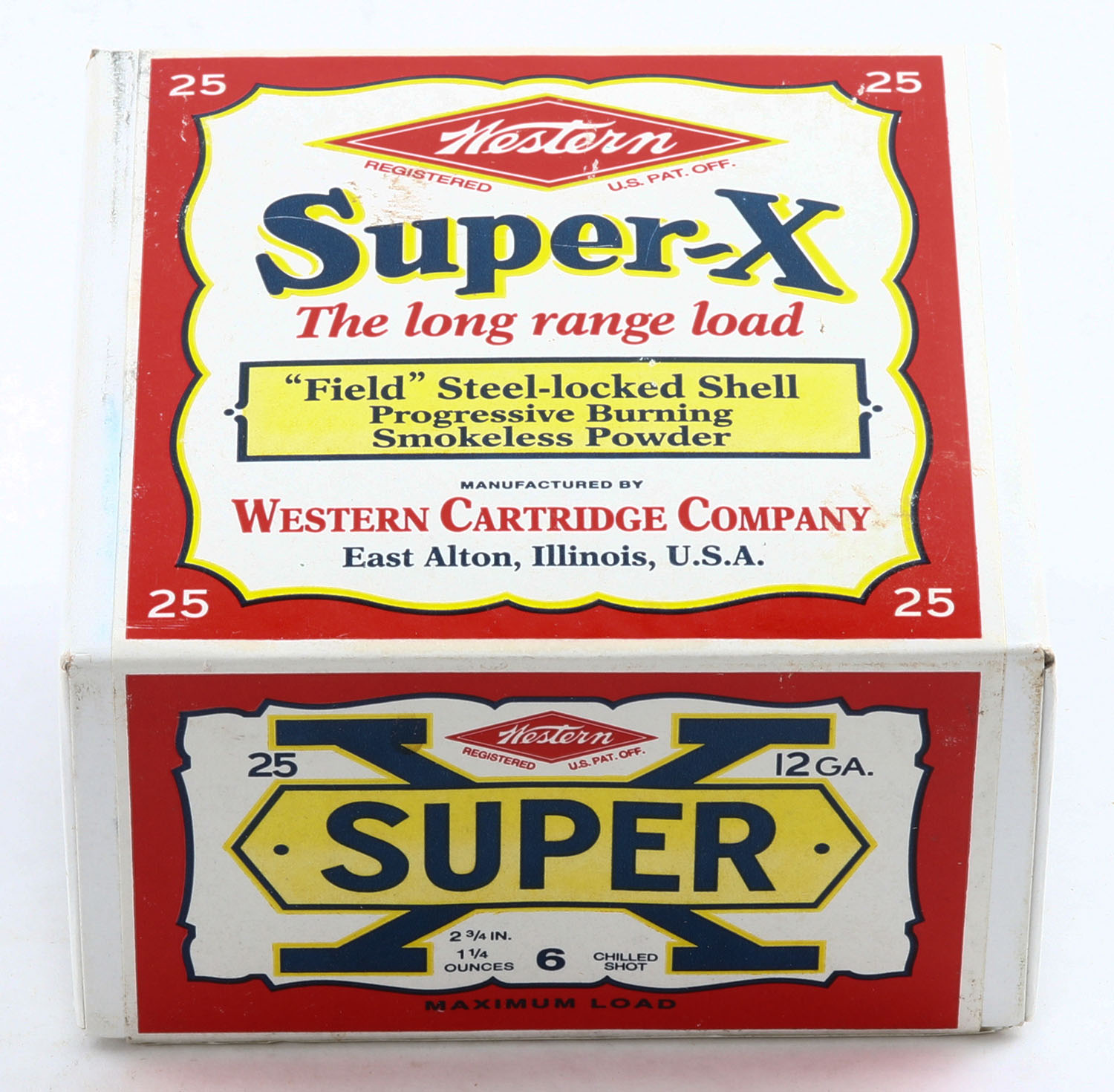 Western, Super-X, 12ga., 2pc., FULL & SEALED, shot size 6 Chilled Shot, 2 3/4'', white box with multi colored label, box & label are great, Circa 1990's. Grade: Excellent ++ - Value: 20 to 80