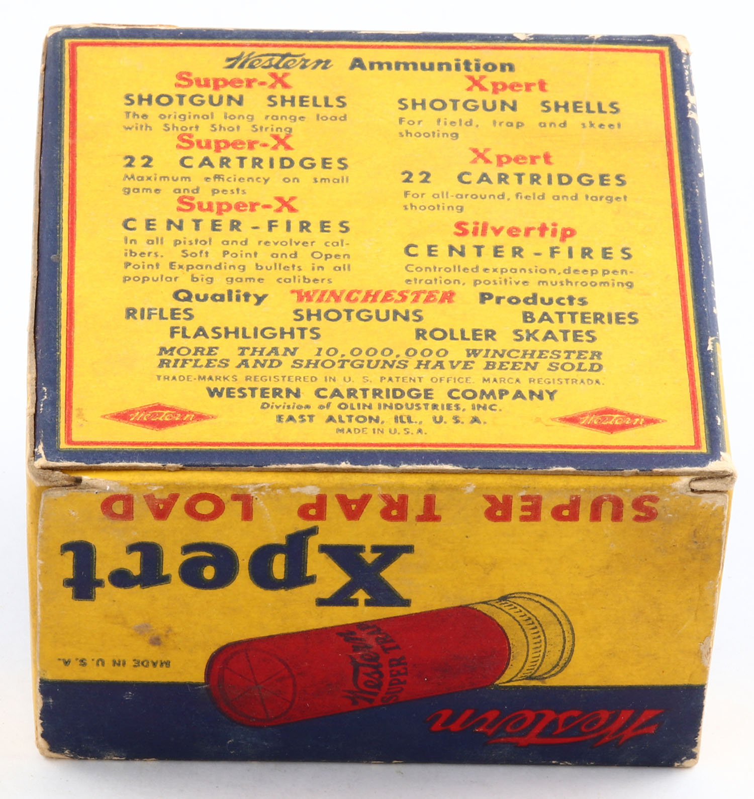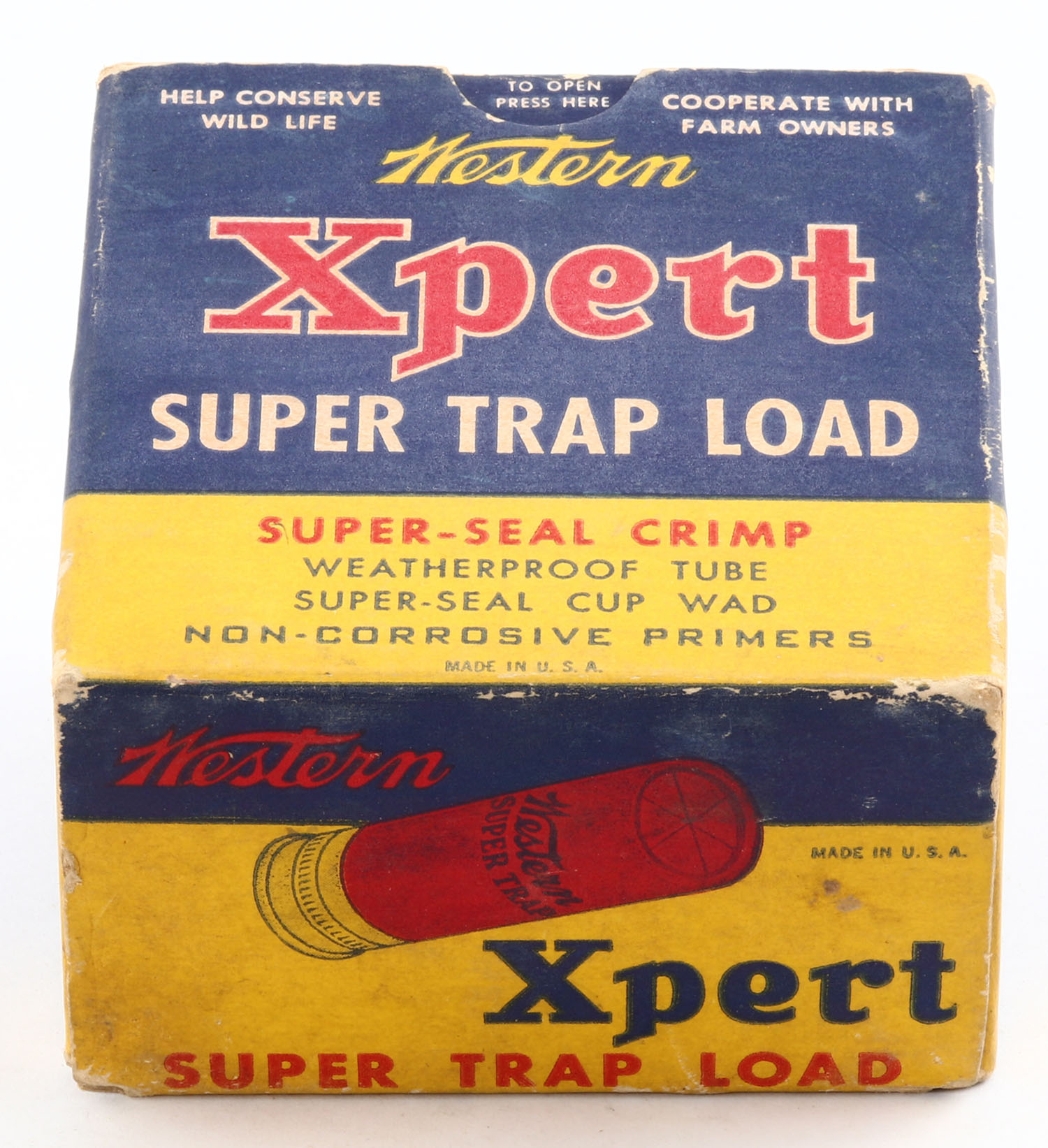 Western Xpert, Super Trap Load, 12ga., 1pc., Full, shot size 7 1/2, 2 3/4'', multi-colored box, box is very solid with light shelf wear and very nice color, paper shells are excellent. Grade: Excellent + - Value: 10 to 30