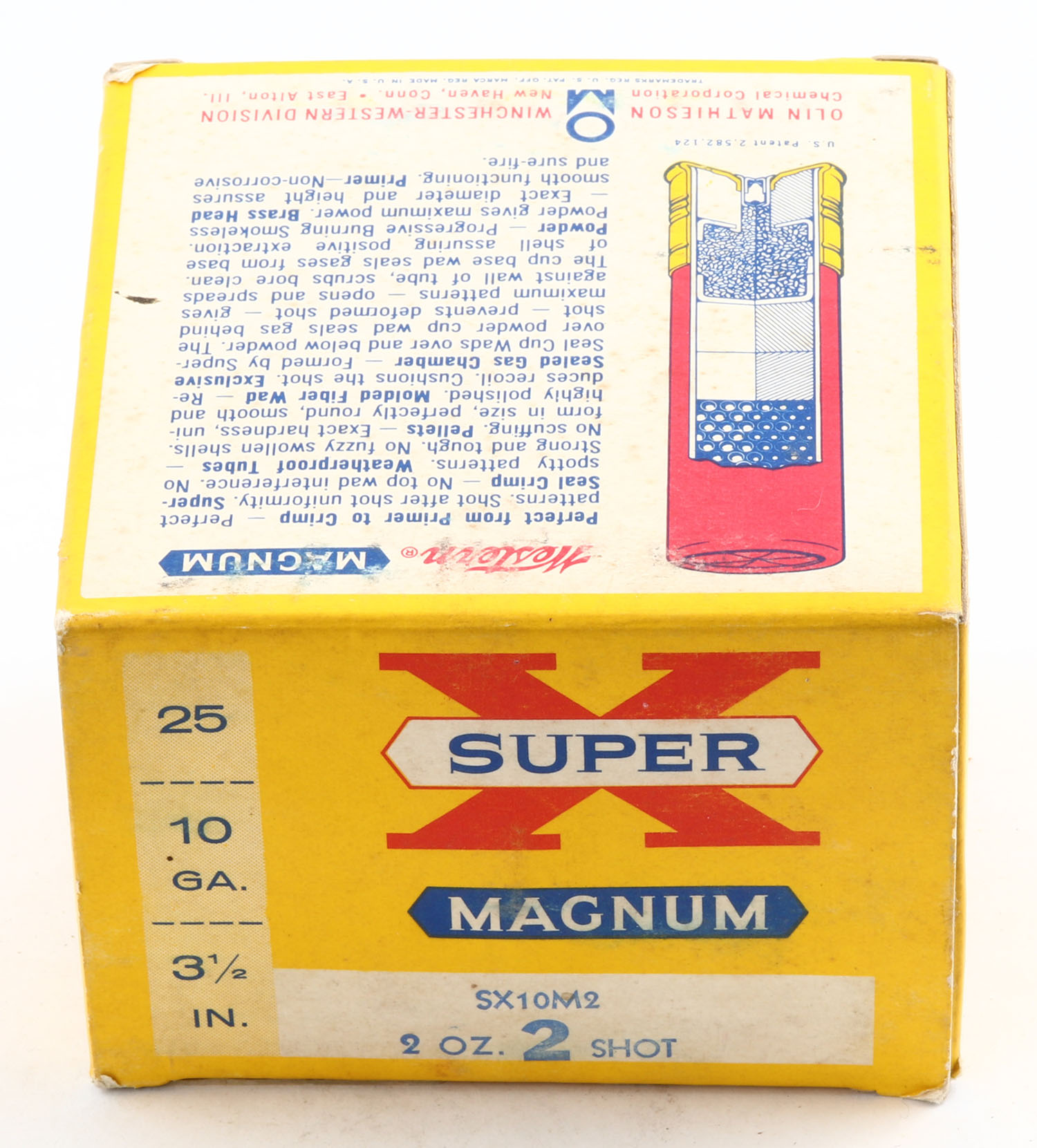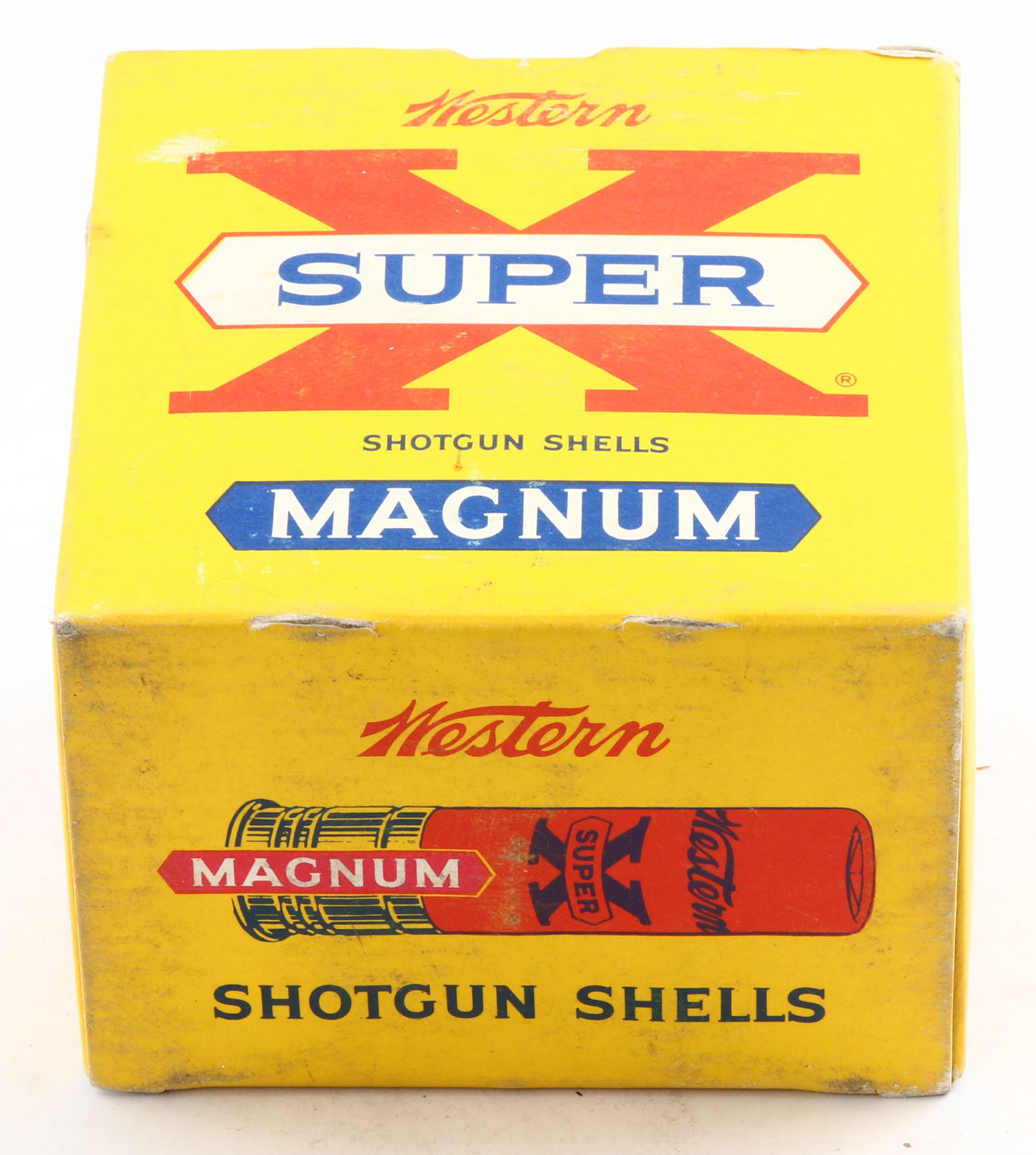 Western, Super X Magnum, 10ga., 3 1/2'', 1pc., Full, shot size 2, yellow, blue & red box, box is very solid with minor scuffing, box has great colors, paper shells are minty. Grade: Excellent + - Value: 30 to 60