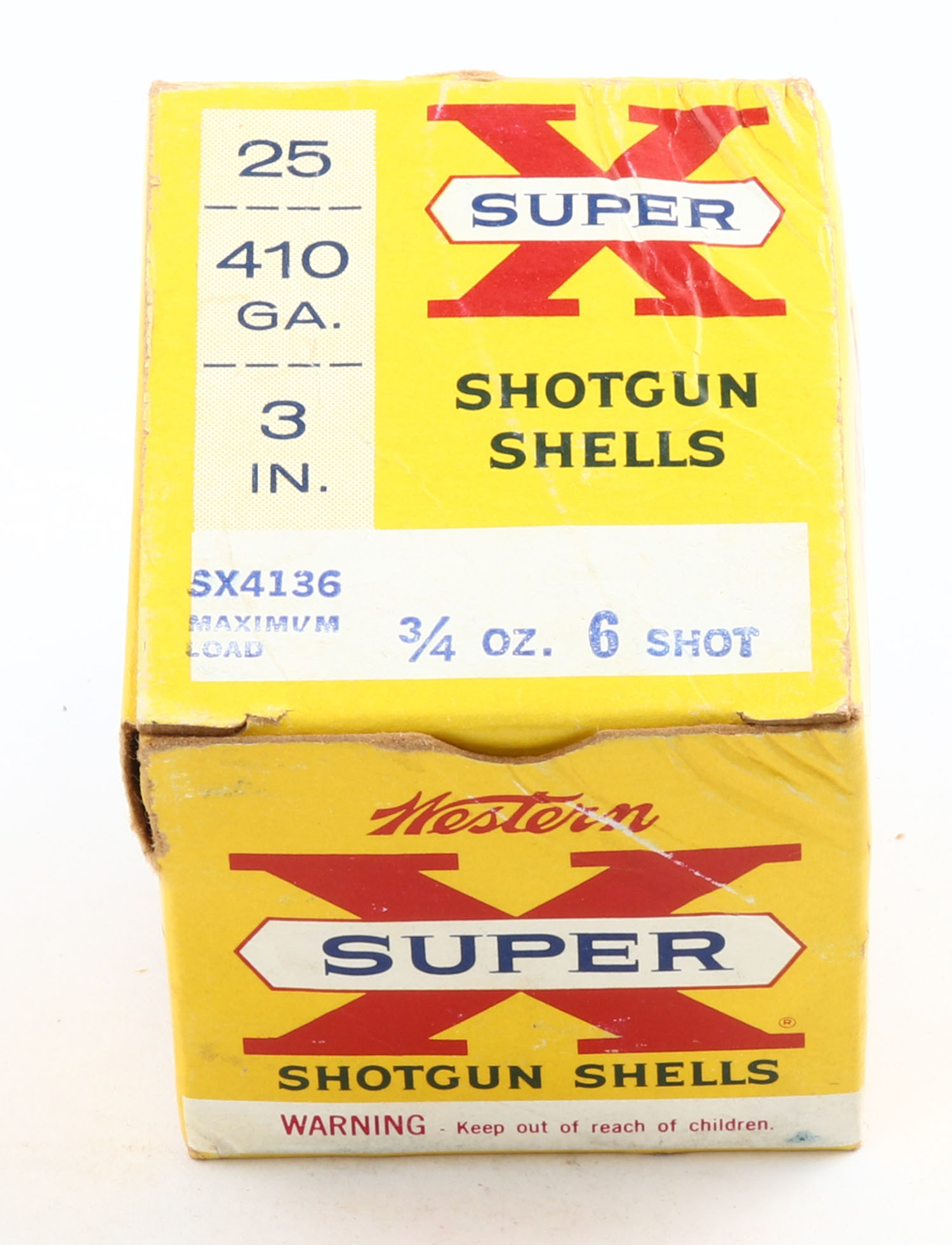 Western, Super X, 410ga., 1pc., Full, shot size 6, 3'', multi-colored box, box has some scuffing, paper shells are excellent. Grade: Very Good ++ - Value: 10 to 40