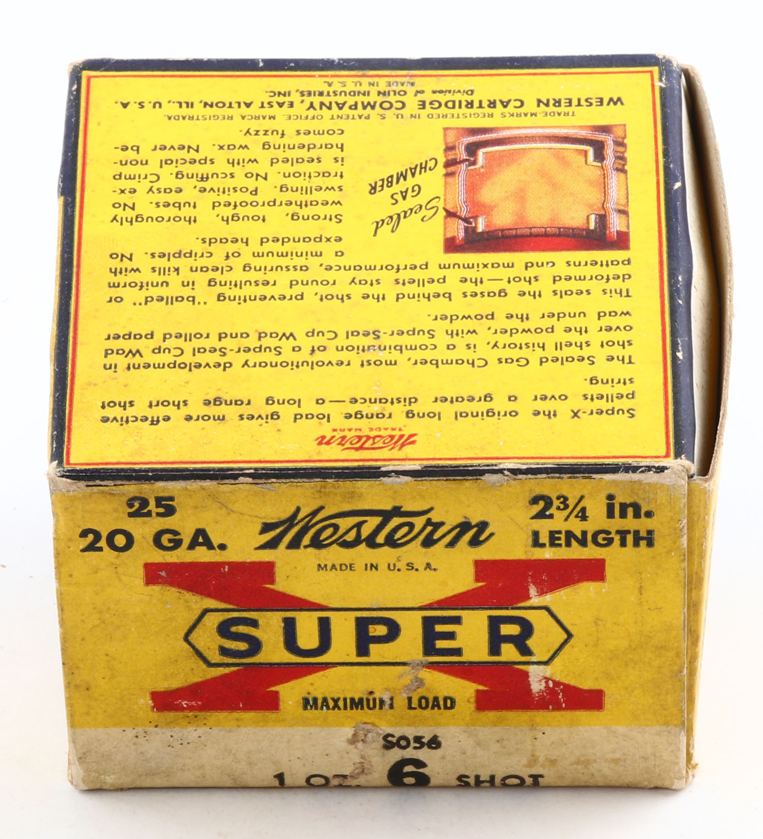 Western, Super X, 20ga., 2 3/4'', 1pc., Full, shot size 6, multi-colored box, box has seam split with some scuffing, paper shells are excellent. Grade: Very Good ++ - Value: 10 to 30