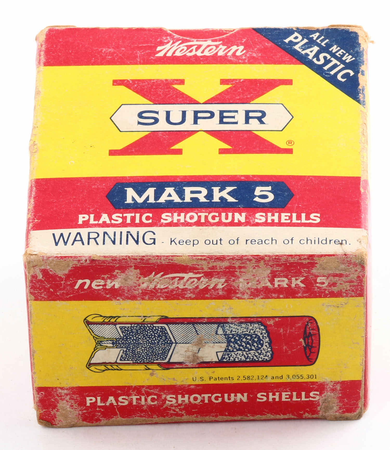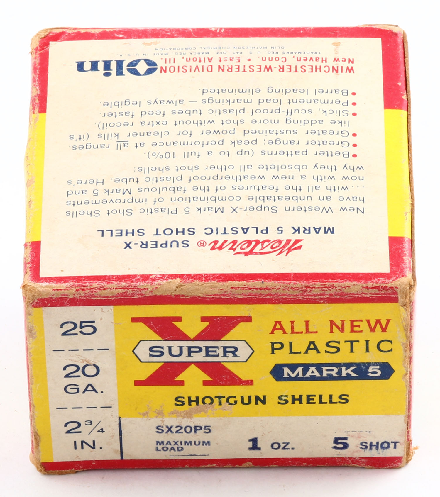 Western, Super X, Mark 5, 20ga., 2 3/4'', 1pc., Full, shot size 5, multi-colored box, box has scuffing & light edge wear, plastic shells are excellent. Grade: Very Good - Value: 10 to 30