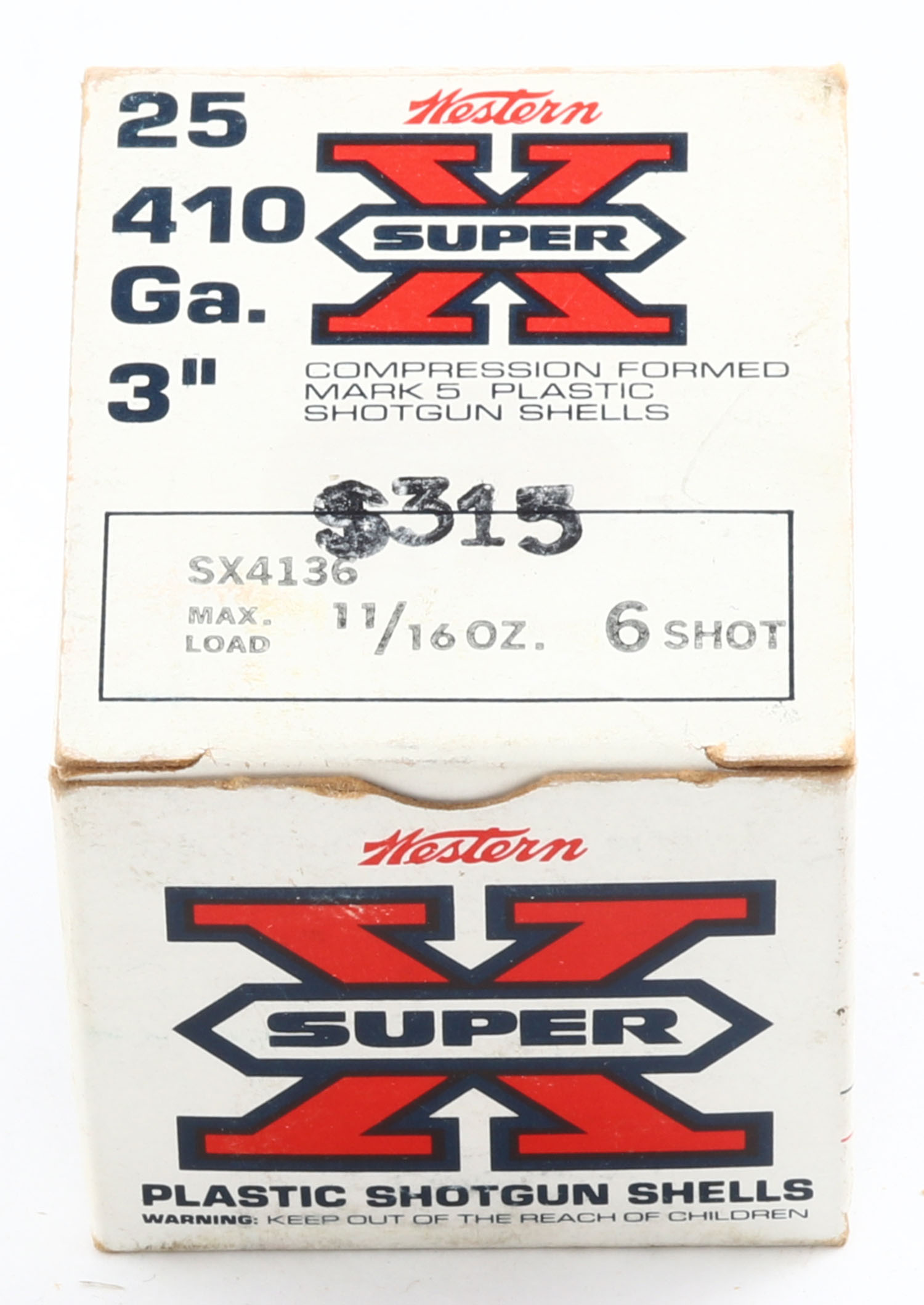Western, Super X, 410ga., 1pc., Full, shot size 6, 3'', multi-colored box, box is solid with some scuffing, plastic shells are excellent. Grade: Very Good ++ - Value: 10 to 40