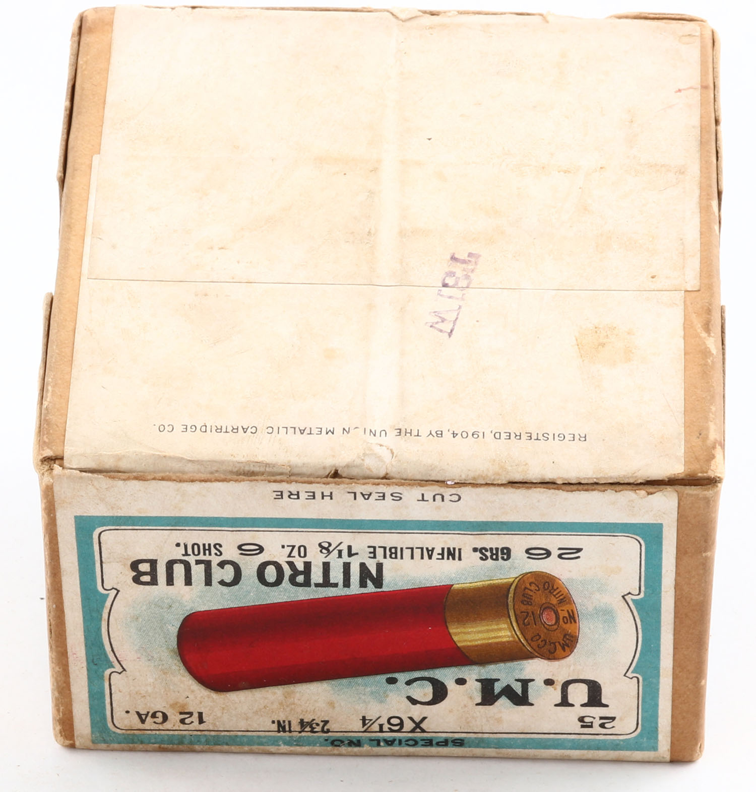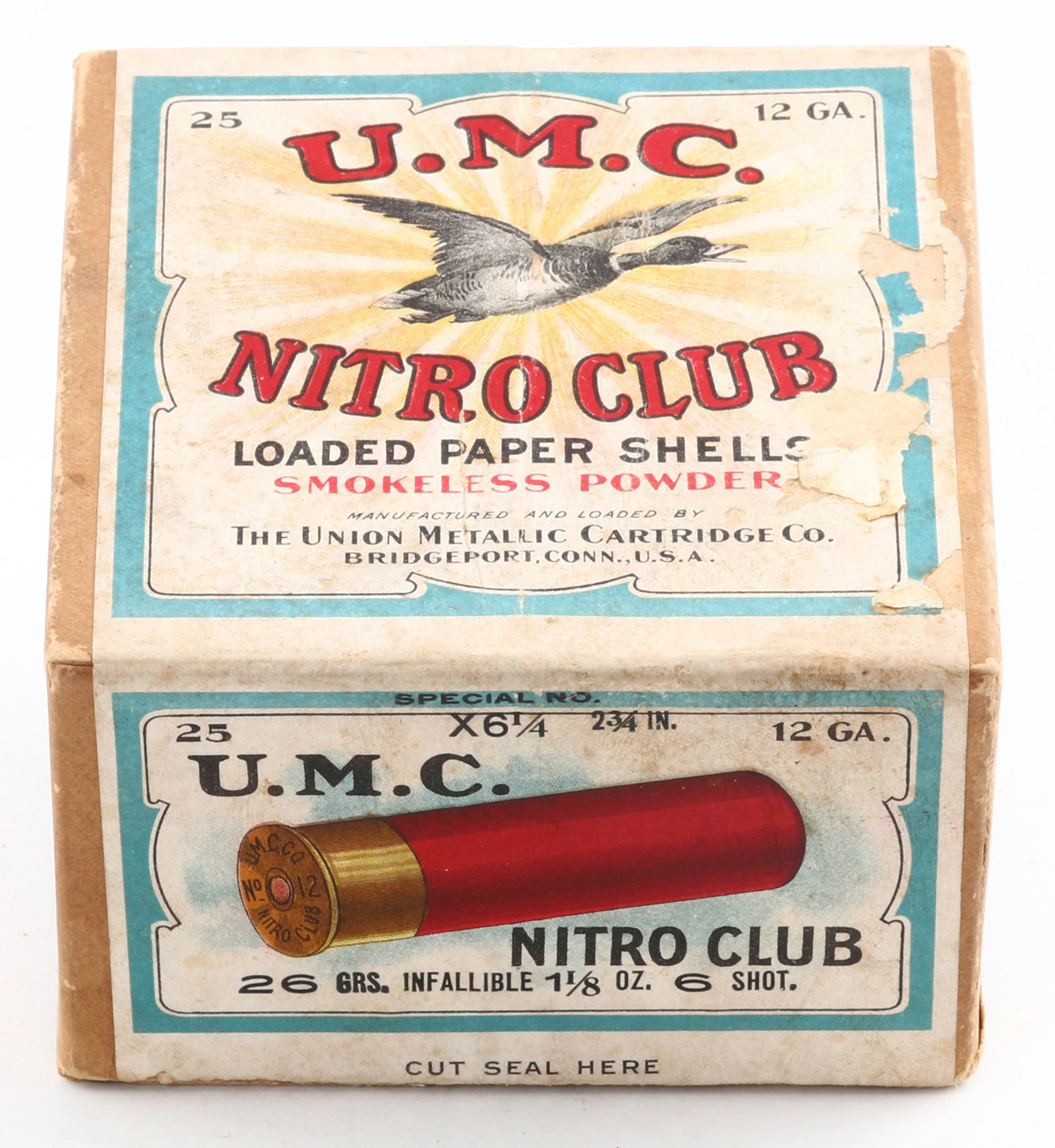 REM UMC, Nitro Club, 12ga., 2pc., Empty, shot size 6, buff box with sunburst logo & Mallard flying on top, box has nice colors to label with age soiling & some scuffing. Grade: Very Good ++ - Value: 50 to 250