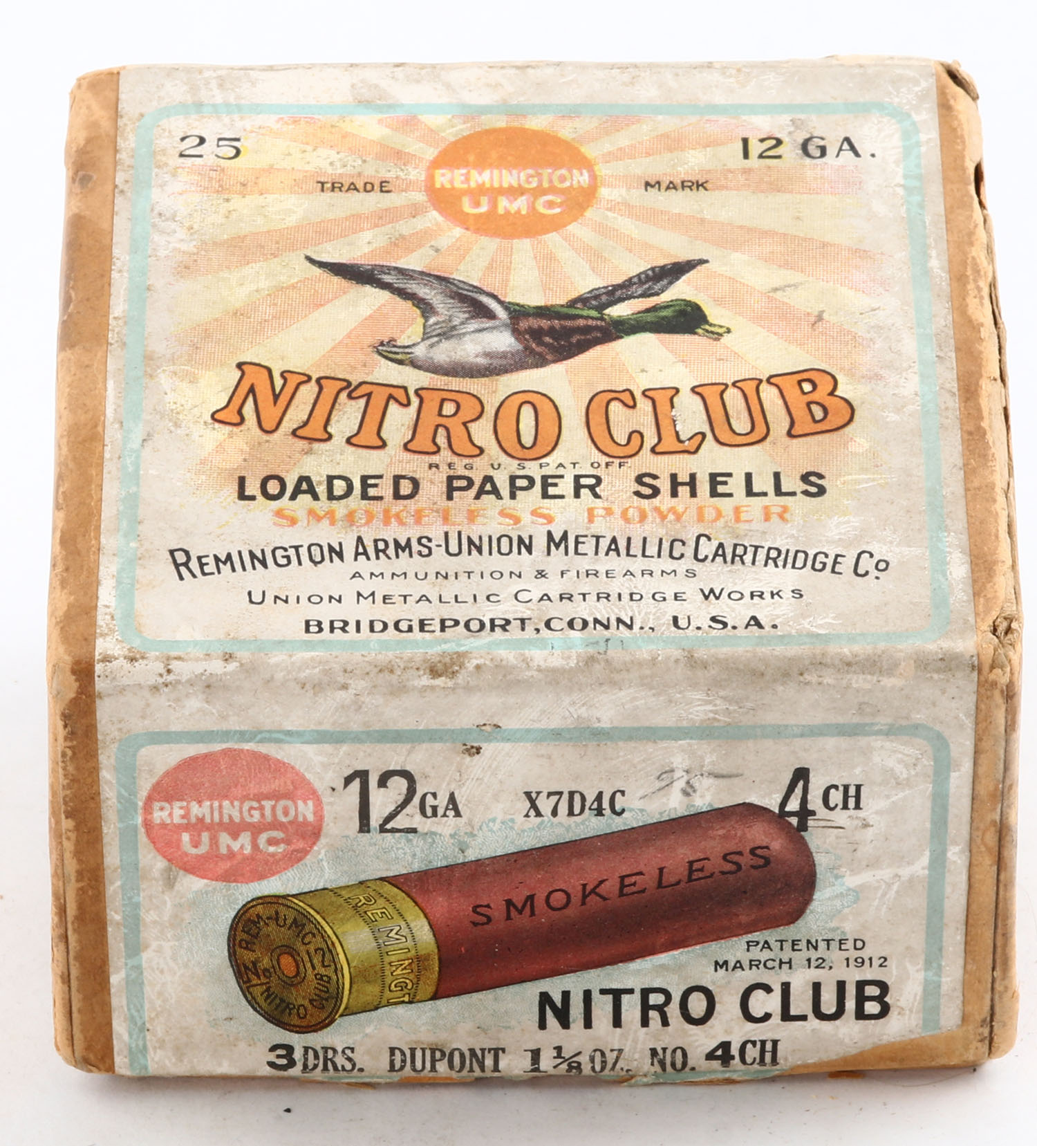 REM U.M.C. Nitro Club, 12 ga, 2pc., Full, shot size 4CH, buff box with sunburst logo & Mallard flying on top, box has a seam split and age soiling, has edge & corner wear, paper shells are excellent. Grade: Very Good + - Value: 40 to 200