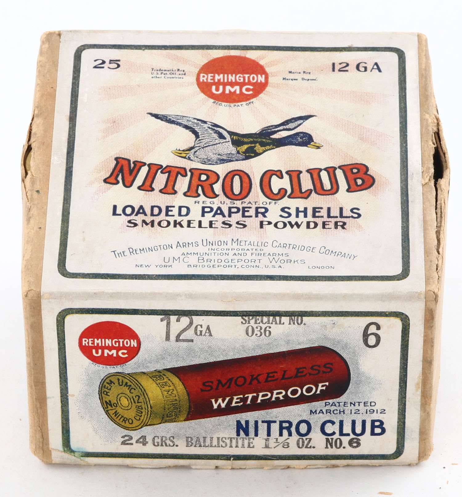 Remington UMC, Nitro Club, 12ga., 2pc., Full, shot size 6, buff box with sunburst logo & Mallard flying on top, box has shell protrusions with light age soiling, has some edge wear & light scuffing to bottom, paper shells are excellent. Grade: Very Good - Value: 40 to 200