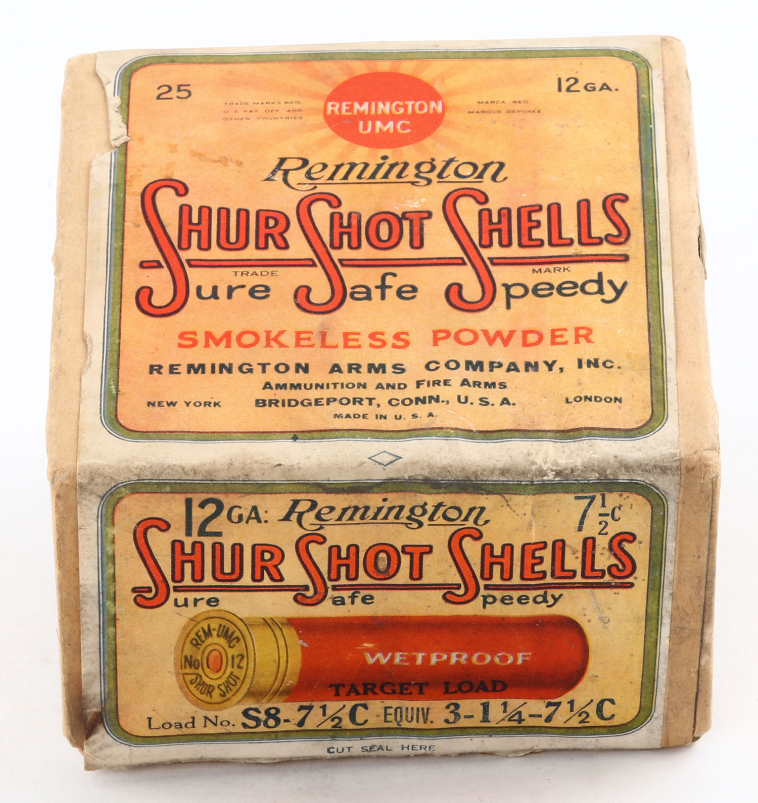Remington UMC, Shur Shot Shells, 12ga., 2pc., Full, shot size 7 1/2 C, buff box with cream, green, white & orange paper label, box has age soiling with scuffing, bottom is missing label, paper shells are good. Grade: Very Good - Value: 40 to 200