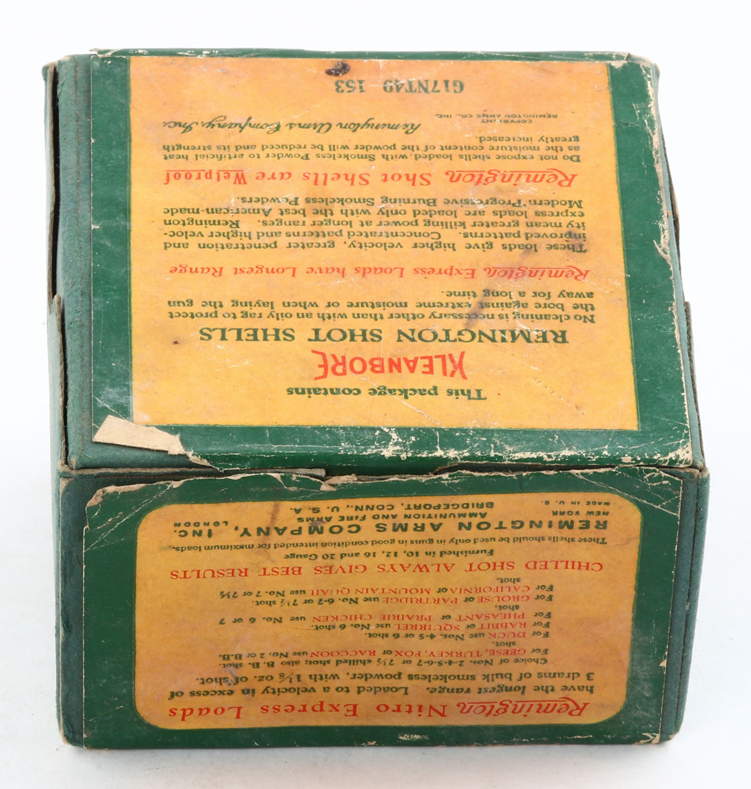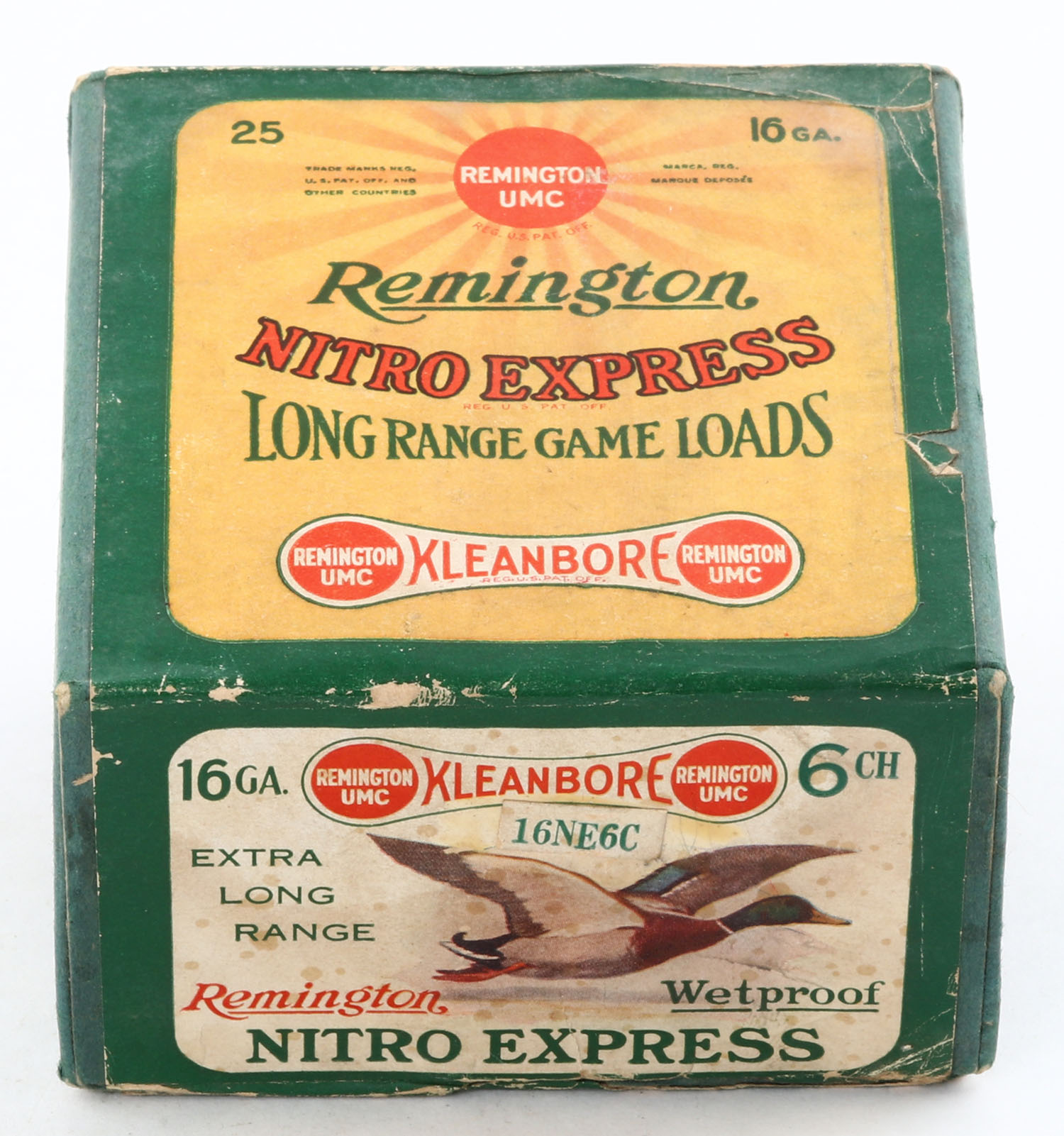 Remington Nitro Express, Long Range Game Loads, pictures Mallard in flight, 16ga., 2pc., Full with 20rds. Being correct shot, shot size 6CH, green box with sunburst logo & MALLARD on side, box has light age soiling & light edge wear, paper shells are good. Grade: Very Good - Value: 40 to 140