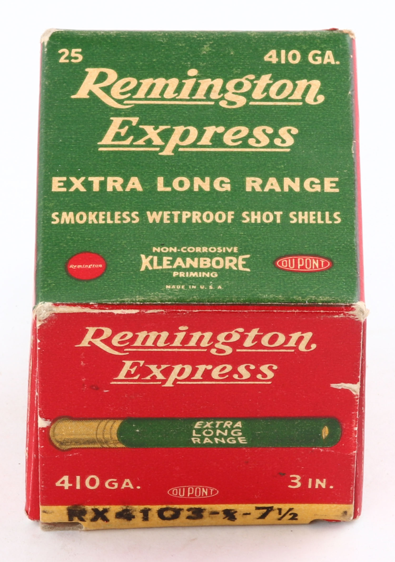 Remington Express, Extra Long Range, 410ga., 3'', 1pc., Partial 22rds, shot size 7 1/2, box is white, yellow, red and green, box has light corner wear with nice colors, paper shells are excellent. Grade: Excellent - Value: 20 to 50
