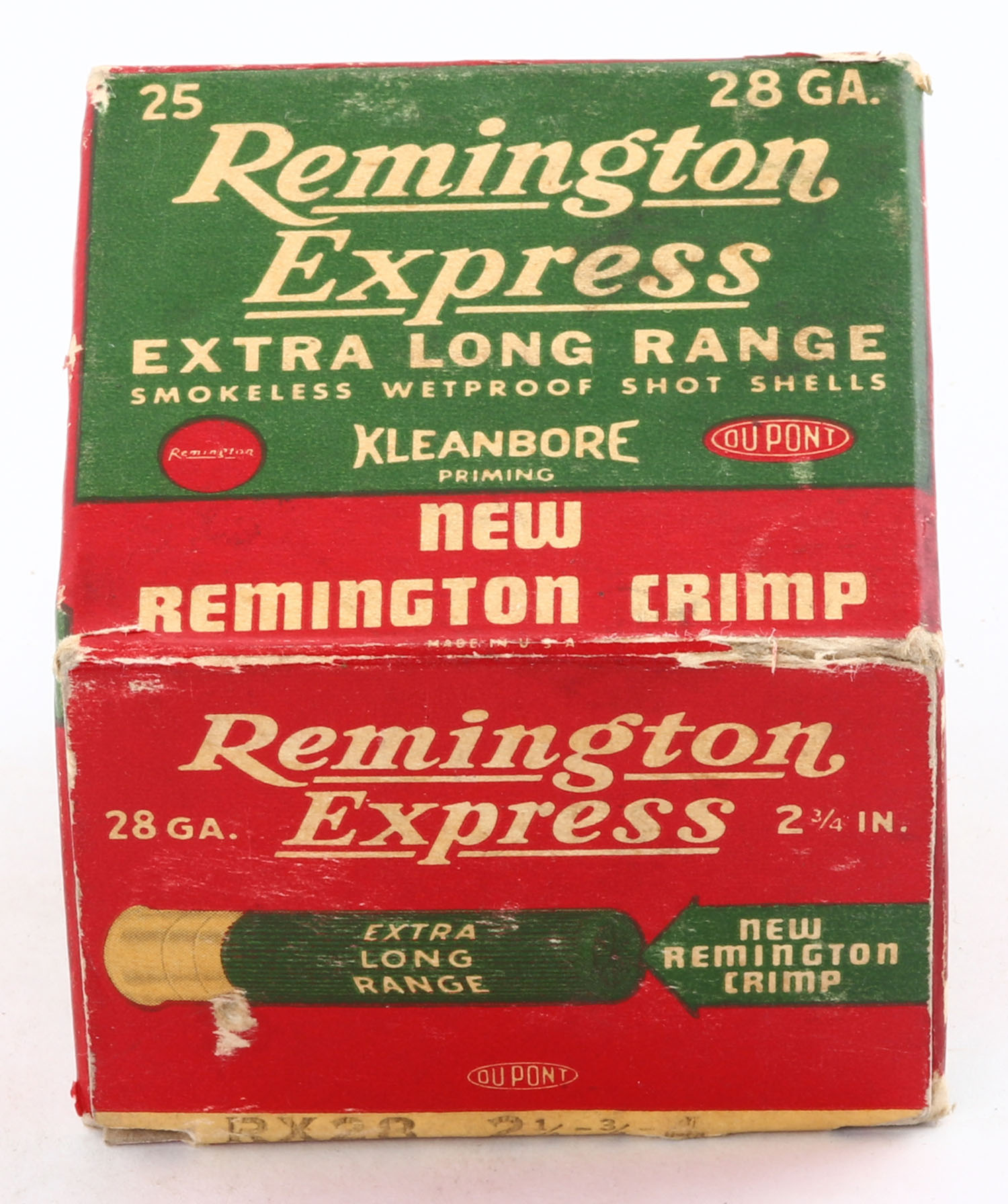 Remington Express, Extra Long Range, 28ga., 2 3/4'', 1pc., Full, shot size 4, box is white, yellow, red and green, box has light scuffing & edge wear, paper shells are very good. Grade: Very Good ++ - Value: 20 to 50