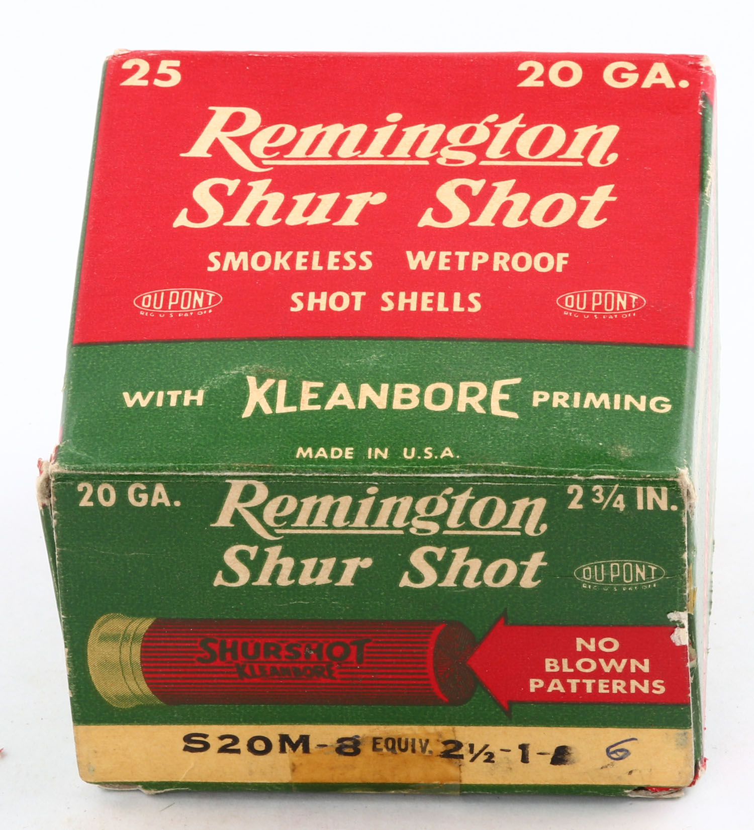 Remington, Shur Shot, 20ga., 2 3/4'', 1pc., Full of wrong shot, shot size 6, box is red, white and green, box is solid with great colors, plastic shells are very good. Grade: Very Good - Value: 10 to 30
