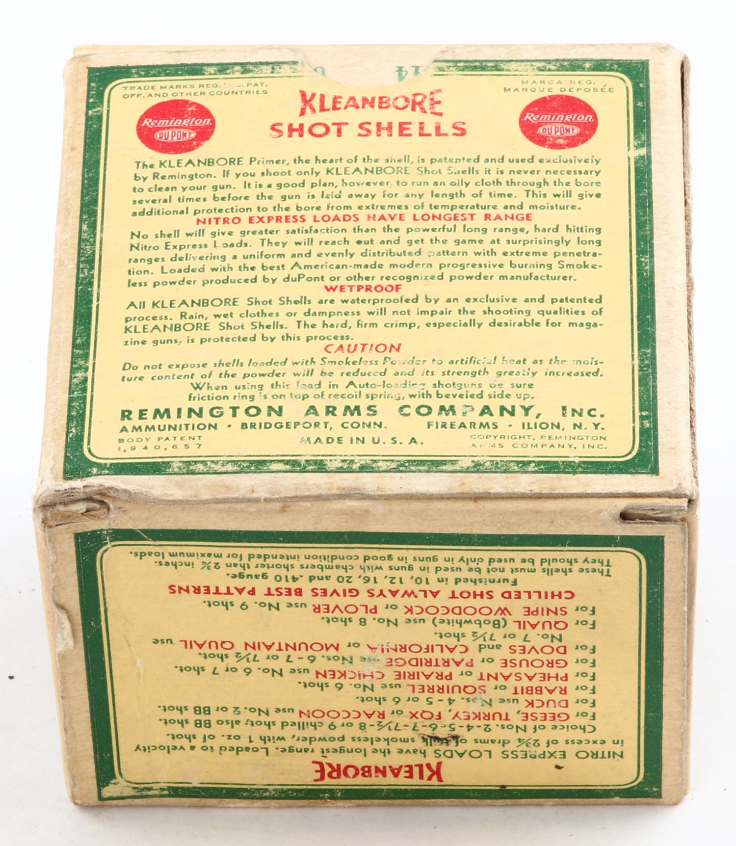 Remington, Kleanbore, NITRO EXPRESS, 20ga., 1pc., Full with 19rds. Being correct, shot size 5C, box is yellow, red and green, box is solid, has light scuffing with great colors, paper shells are very good. Grade: Very Good + - Value: 20 to 60