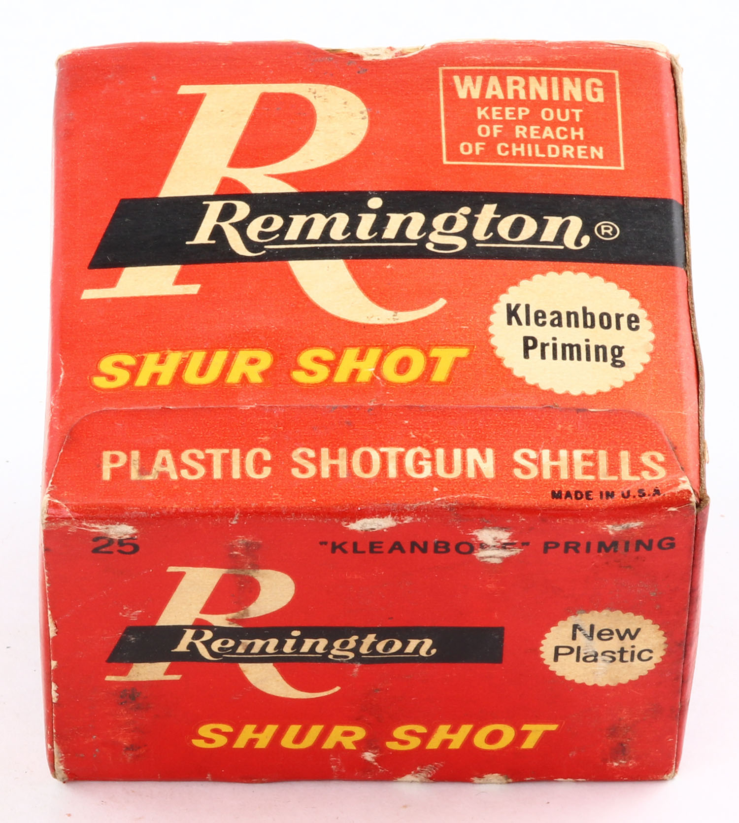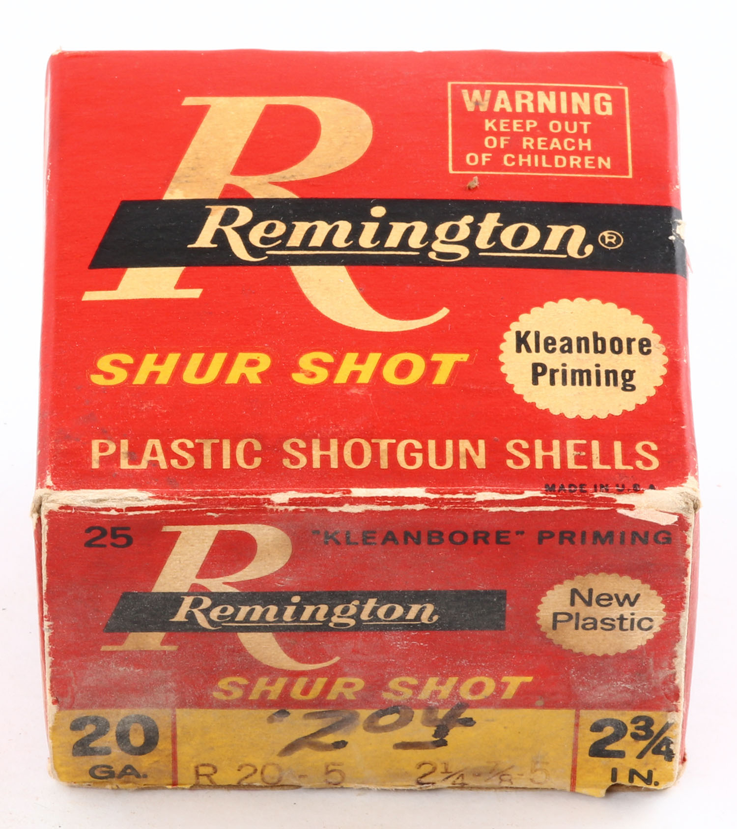 Remington Shur Shot, 20ga., 2 3/4'', 1pc., Full, shot size 5, box is white, yellow, red and black, box has scuffing, plastic shells are excellent. Grade: Very Good - Value: 10 to 30