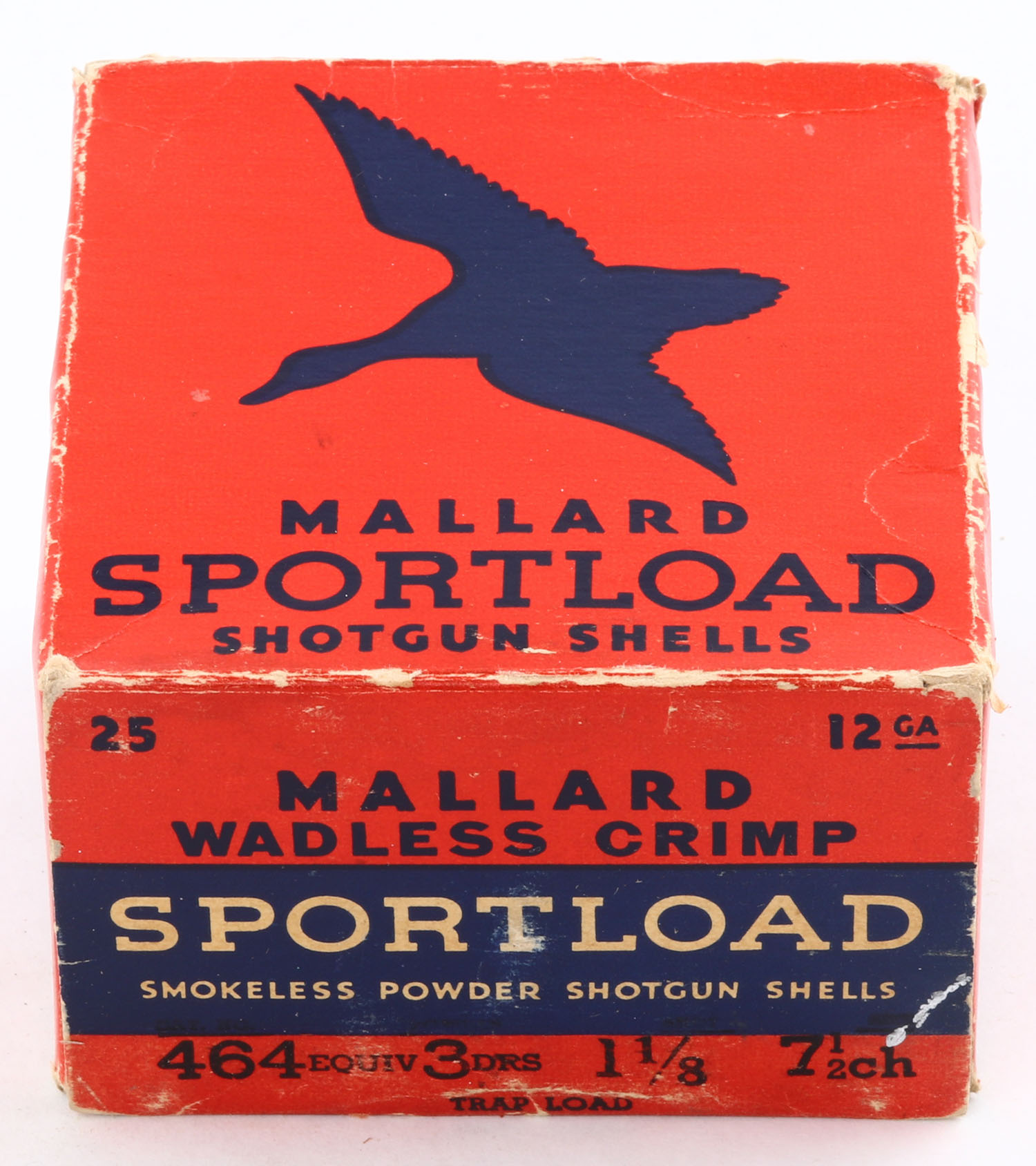 Sears, Sportload MALLARD, 12ga., 1pc., Full with 24rds being correct, shot size 7 1/2ch, red & blue box that pictures a Mallard in flight, box has edge wear with nice colors, paper shells are excellent. Grade: Very Good ++ - Value: 40 to 80