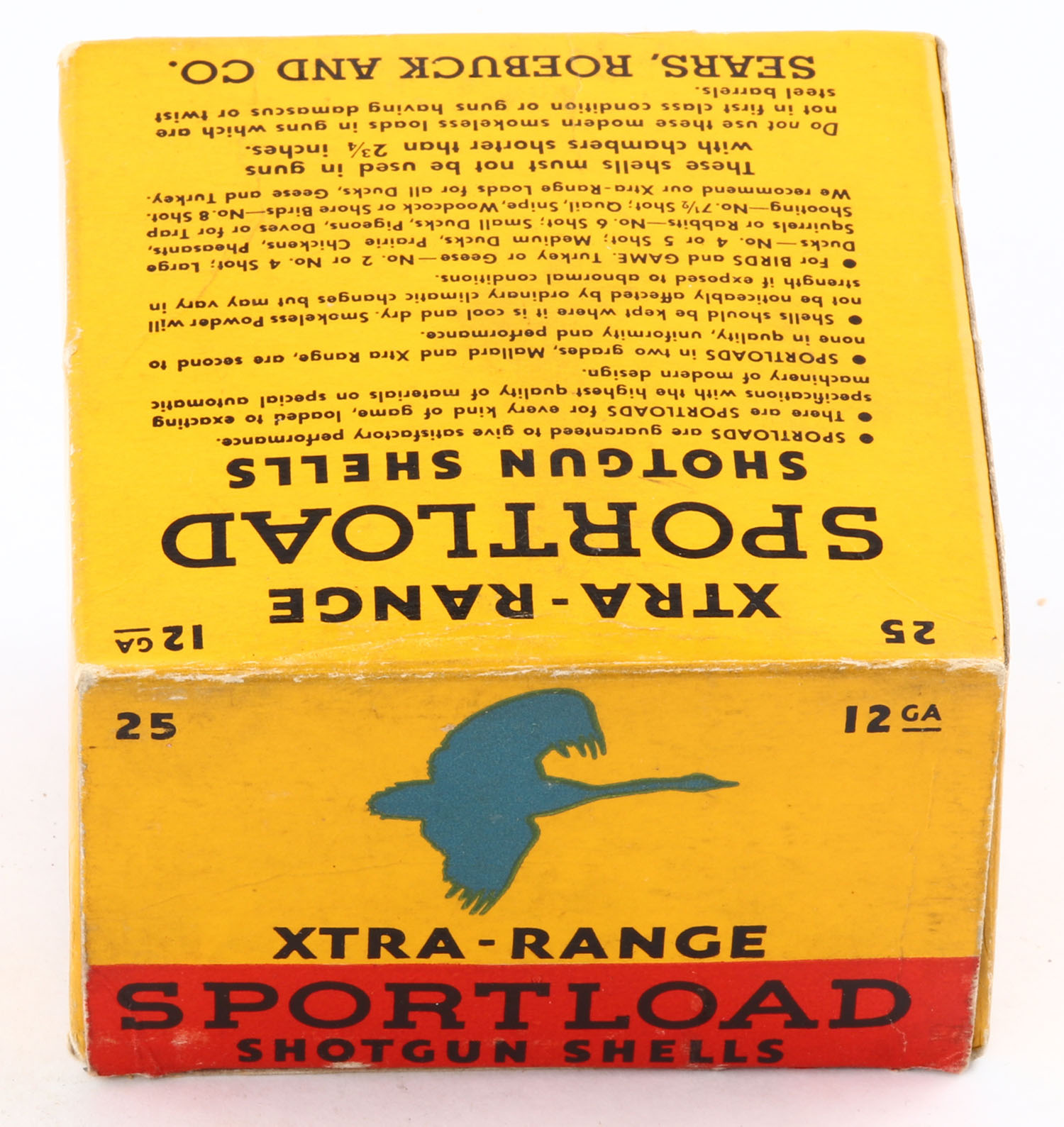 Sears Sportload, XTRA-RANGE, 12ga., 1pc., Empty, shot size 4, buff box with yellow, blue & red label that pictures a Goose in flight, box has some scuffing with excellent colors. Grade: Excellent - Value: 10 to 40