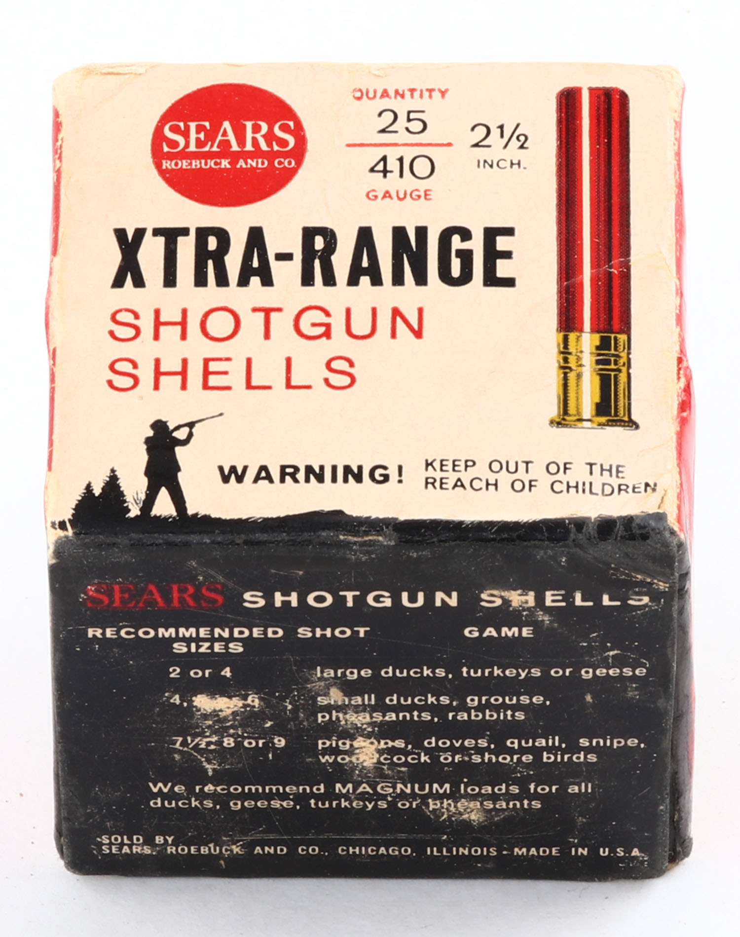 Sears, Xtra-Range, 410ga., 1pc., Full, Shot Size 6, 2 1/2'', box is very solid, paper shells are excellent. Grade: Very Good ++ - Value: 10 to 40