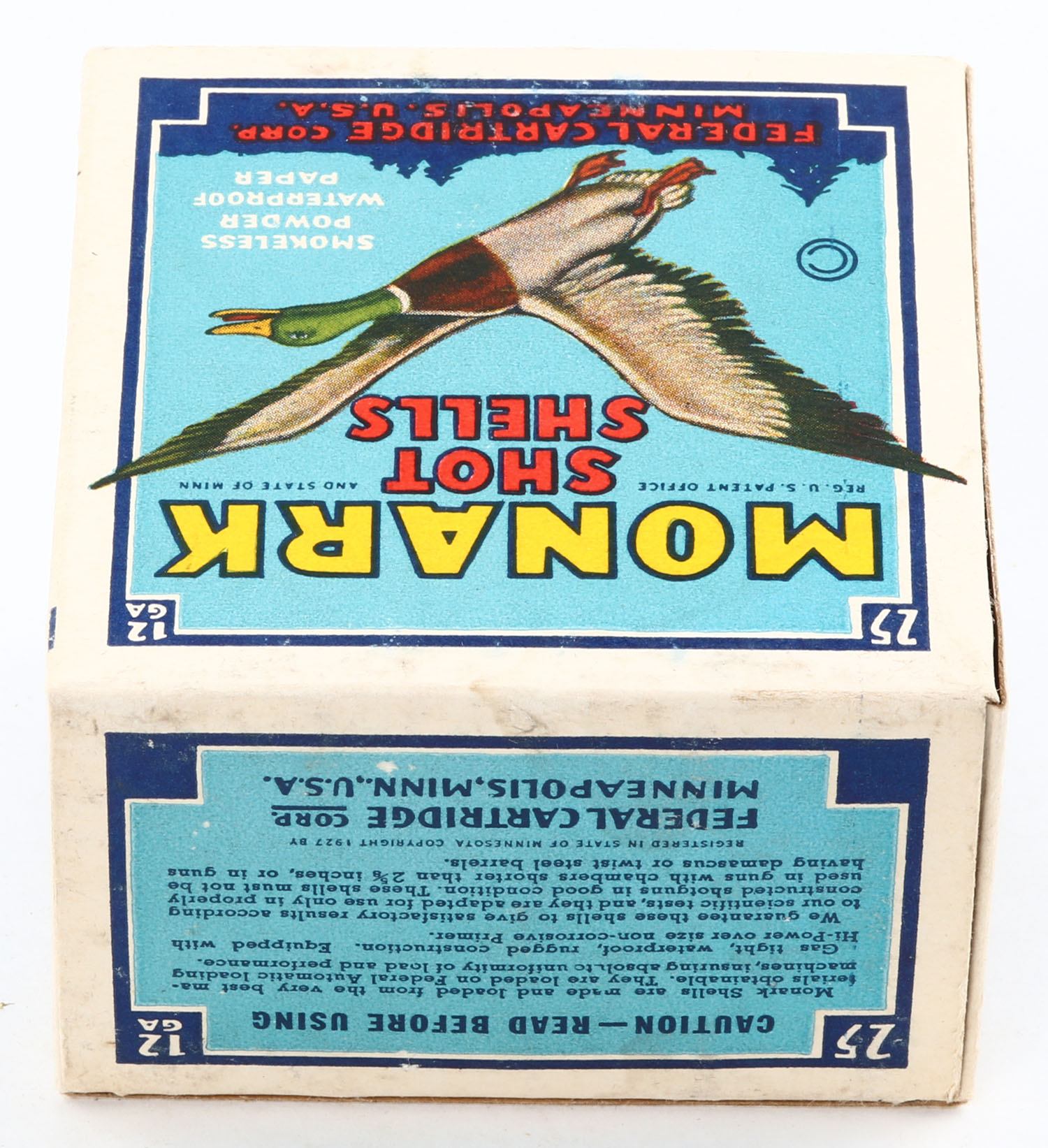 Federal Cart. Co., MONARK, U.S. Property, 12ga., 1pc., Empty, shot size 9 Skeet Load, Blue border, black, yellow and red box with flying mallard, box is very solid with excellent colors. Grade: Excellent ++ - Value: 10 to 60