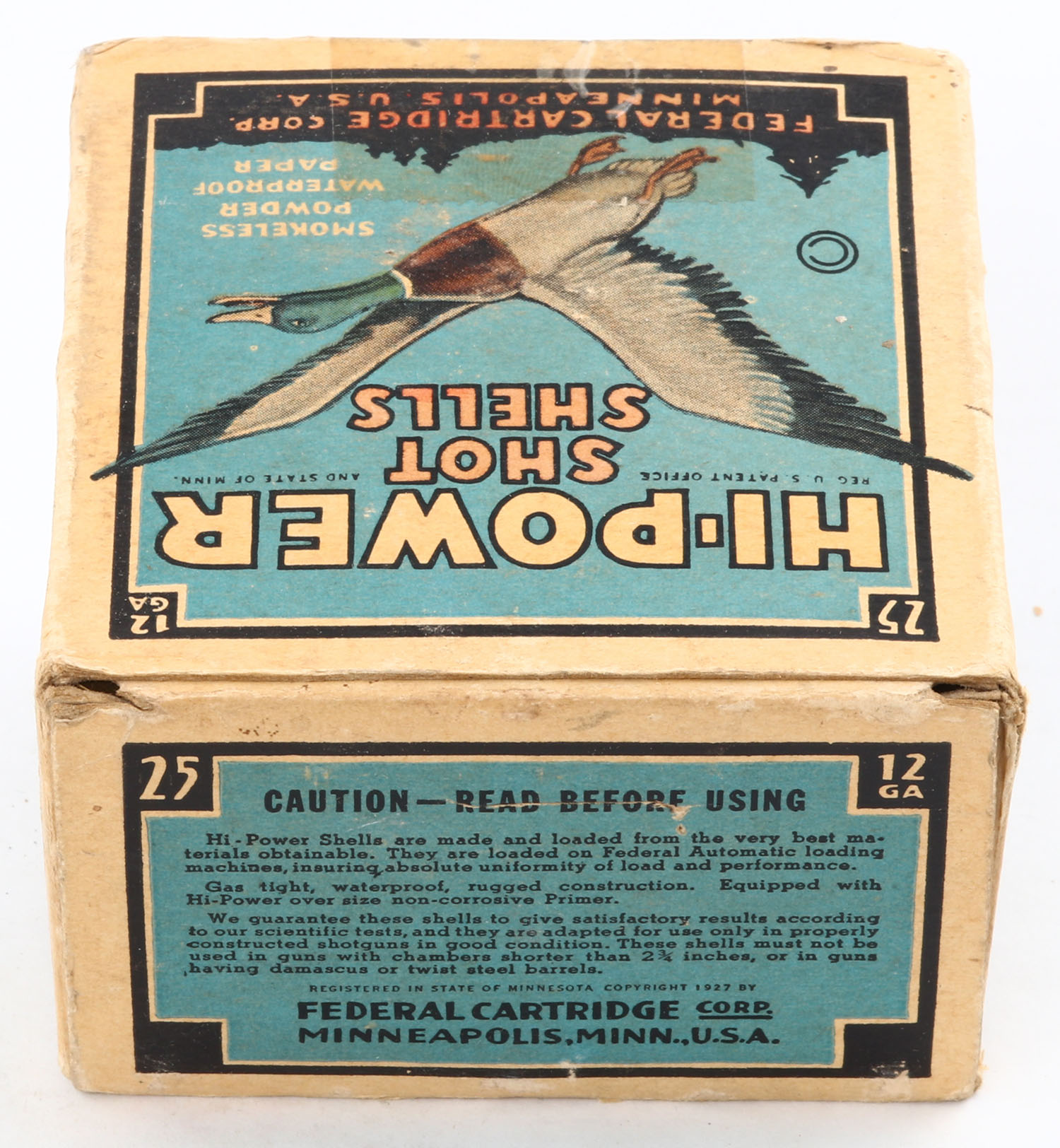 Federal Cart. Co., HI-POWER, 12ga., 1pc., Full, shot size 6, Black border, blue, yellow and red box with flying mallard, box has light age soiling with edge wear, box is missing bottom flap, paper shells are very good. Grade: Very Good - Value: 10 to 40