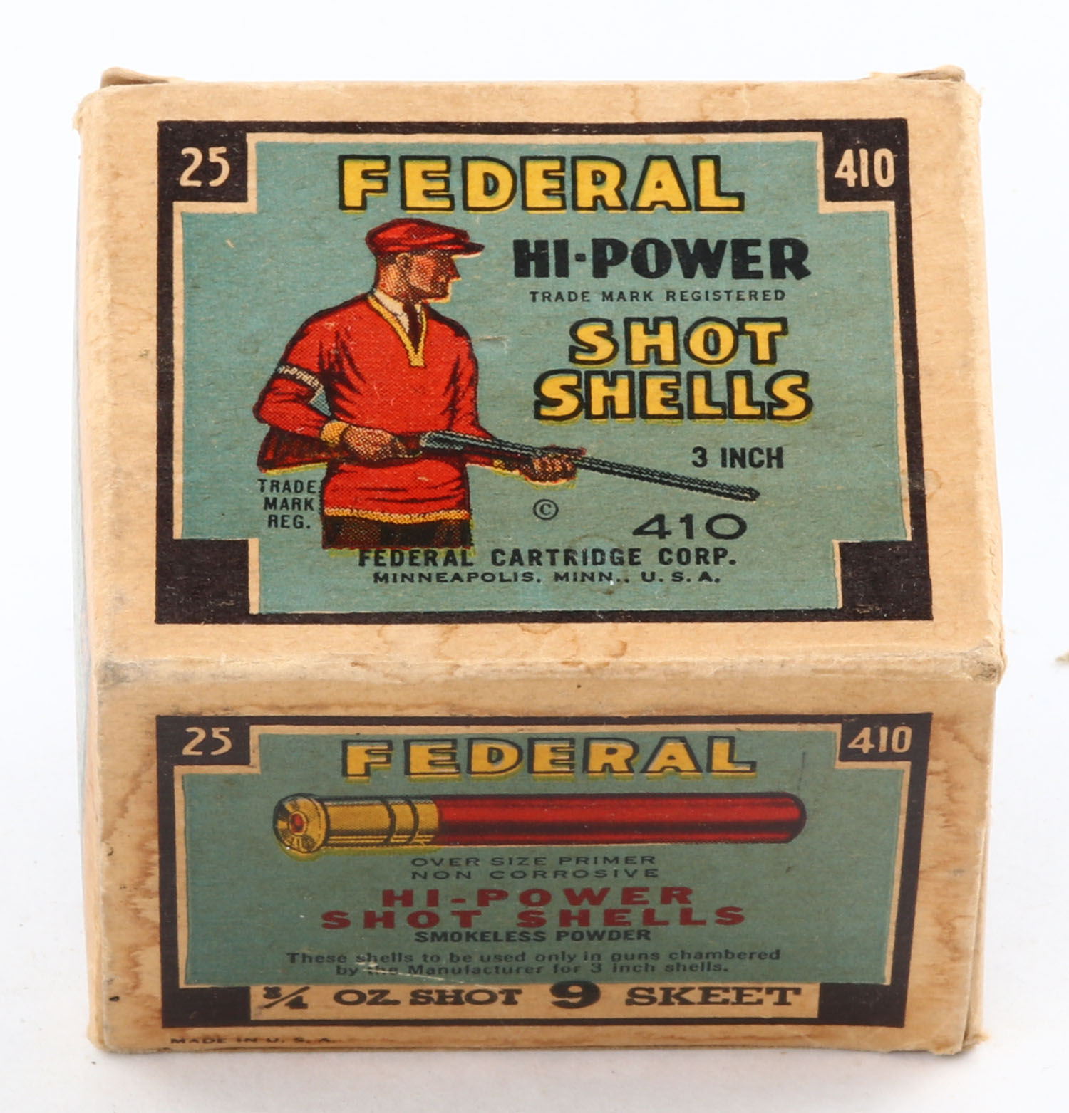 Federal Cart. Co., HI-POWER, 410ga., 3'', 1pc., Partial 11rds., shot size 9 Skeet, Black border, blue, yellow and red box with Trap Shooter, box has light soiling with great colors, paper shells are excellent. Grade: Very Good - Value: 10 to 40