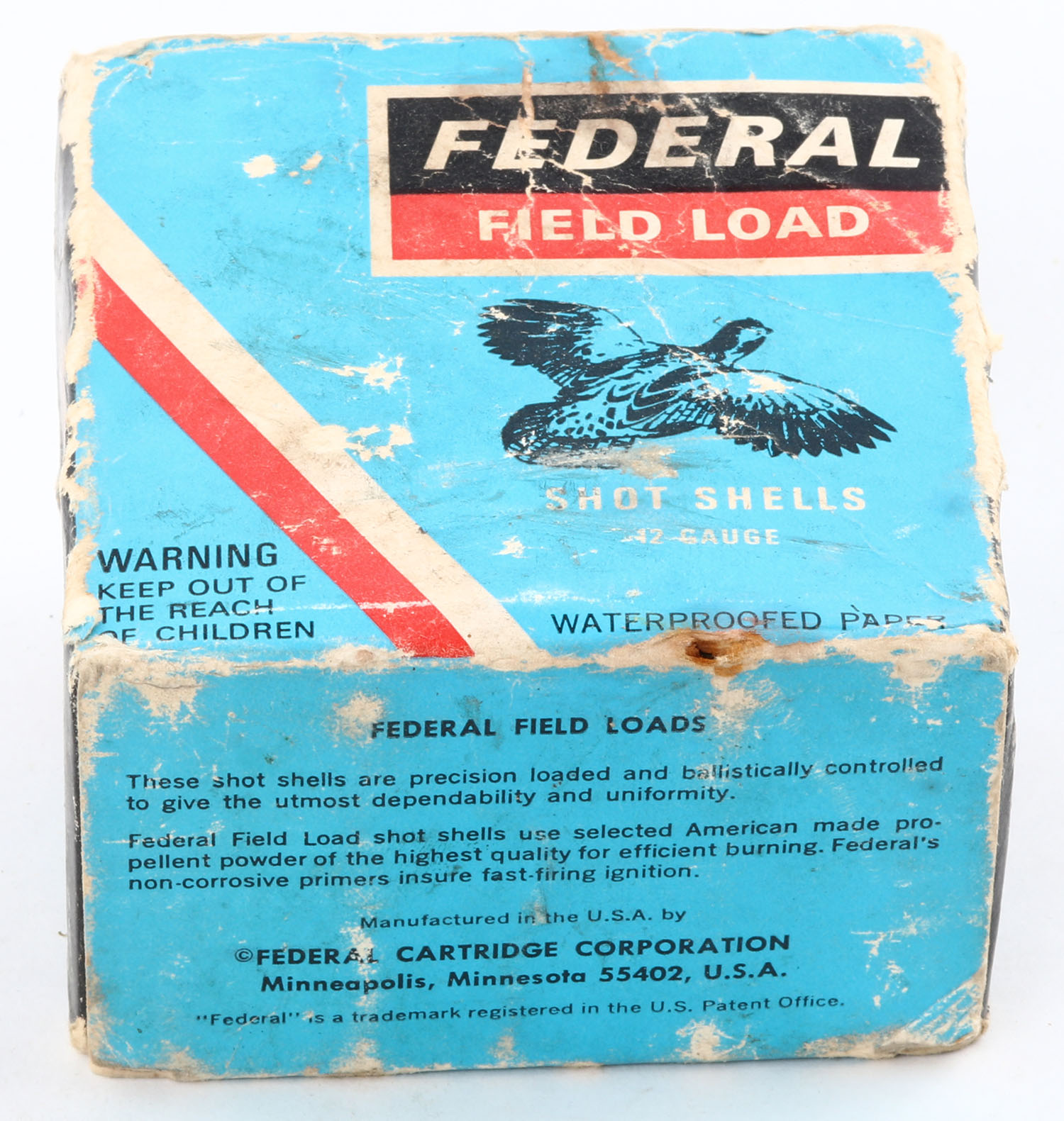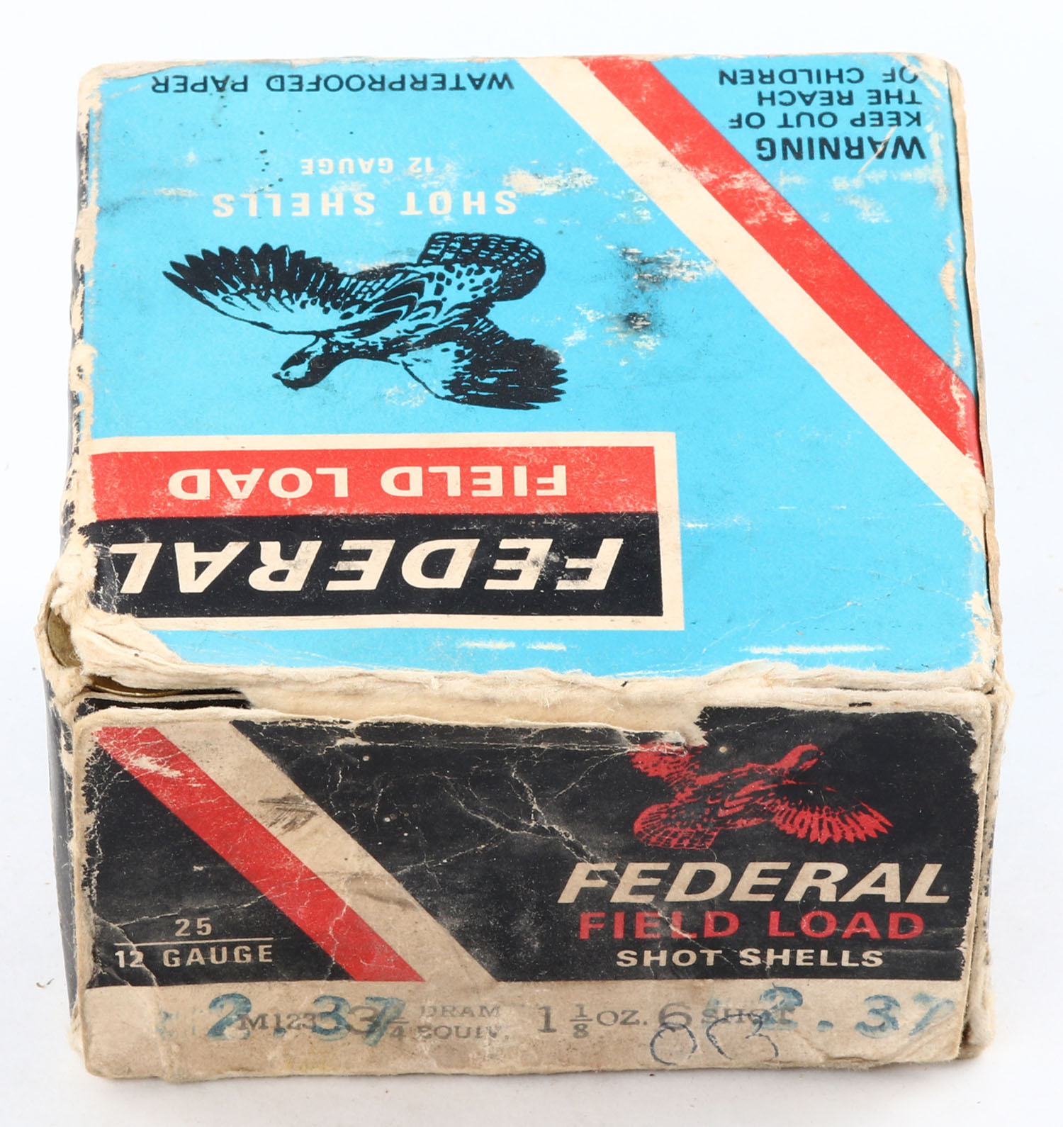 Federal, Field Load, 12ga., 1pc., 2 3/8'', Full, shot size 6, multi-colored box, box has age soiling with edge wear, paper shells are very good. Grade: Good + - Value: 8 to 20
