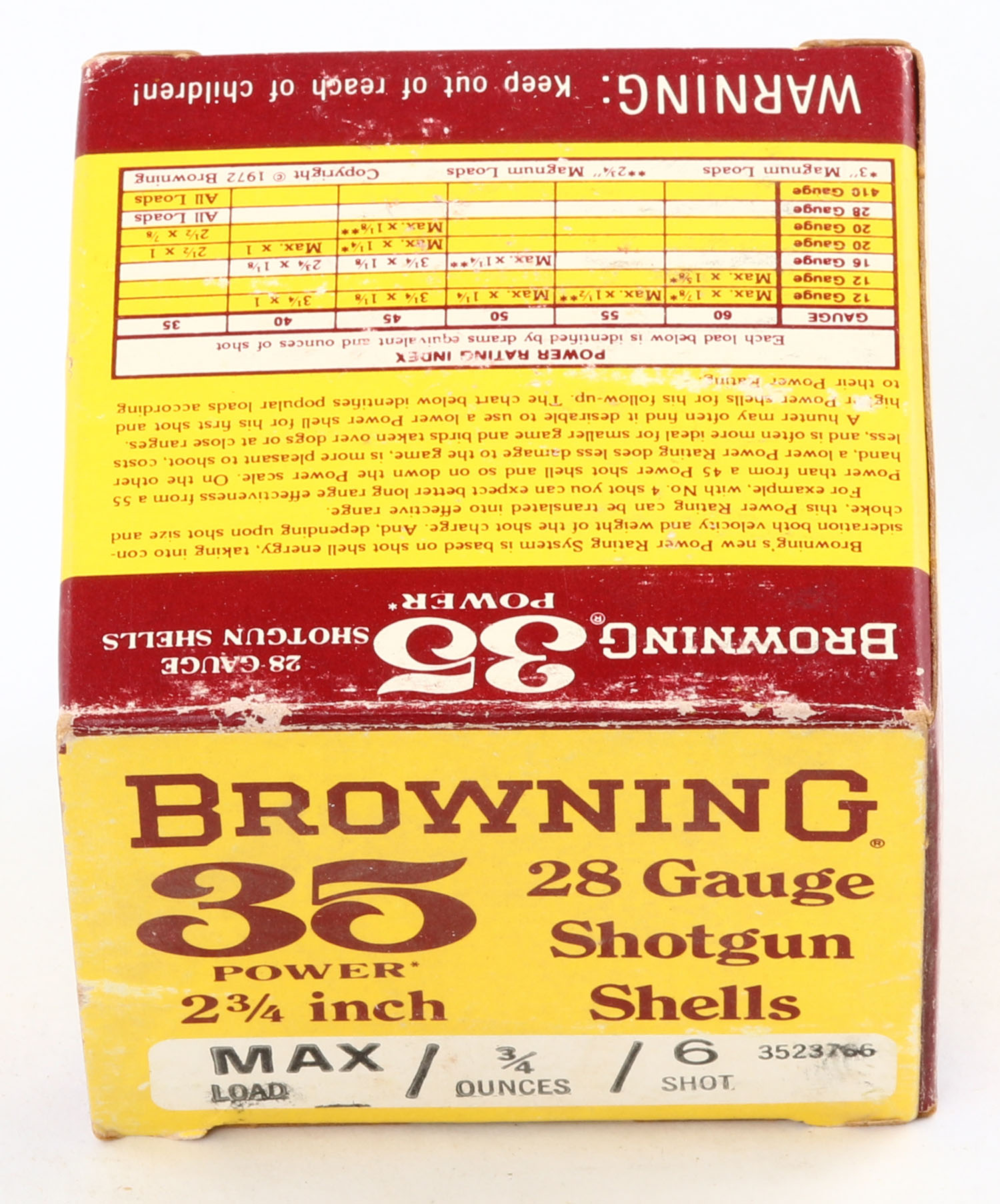 Browning, 35 Power, 28ga., 2 3/4'', 1pc., Full, shot size 6, maroon, yellow & white box, box is very solid with great color, paper shells are excellent. Grade: Excellent + - Value: 20 to 60