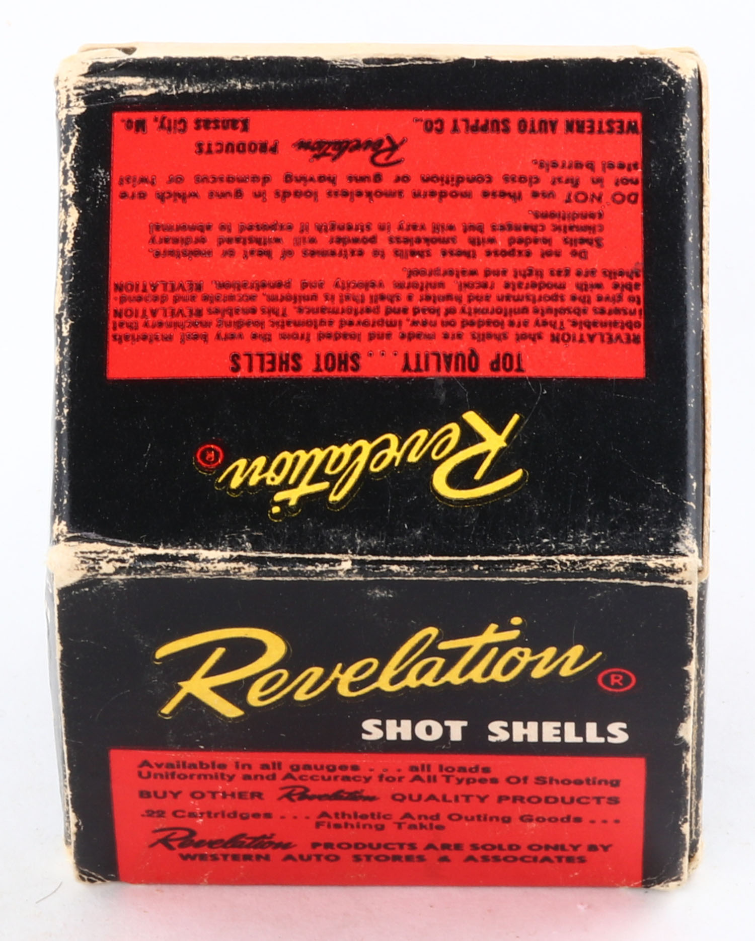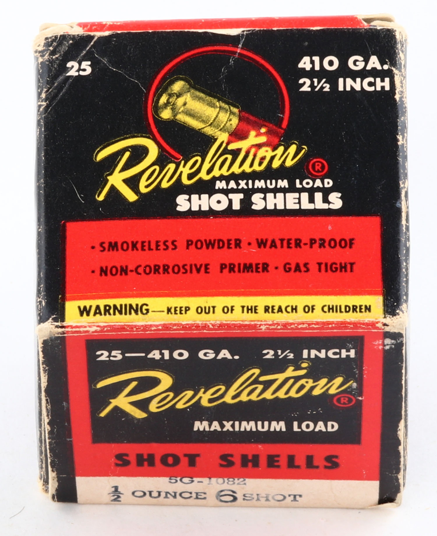 Revelation, 410ga., 2 1/2'', 1pc., Partial 17rds, shot size 6, multi-colored box, box has edge wear with scuffing, paper shells are excellent. Grade: Very Good - Value: 10 to 30