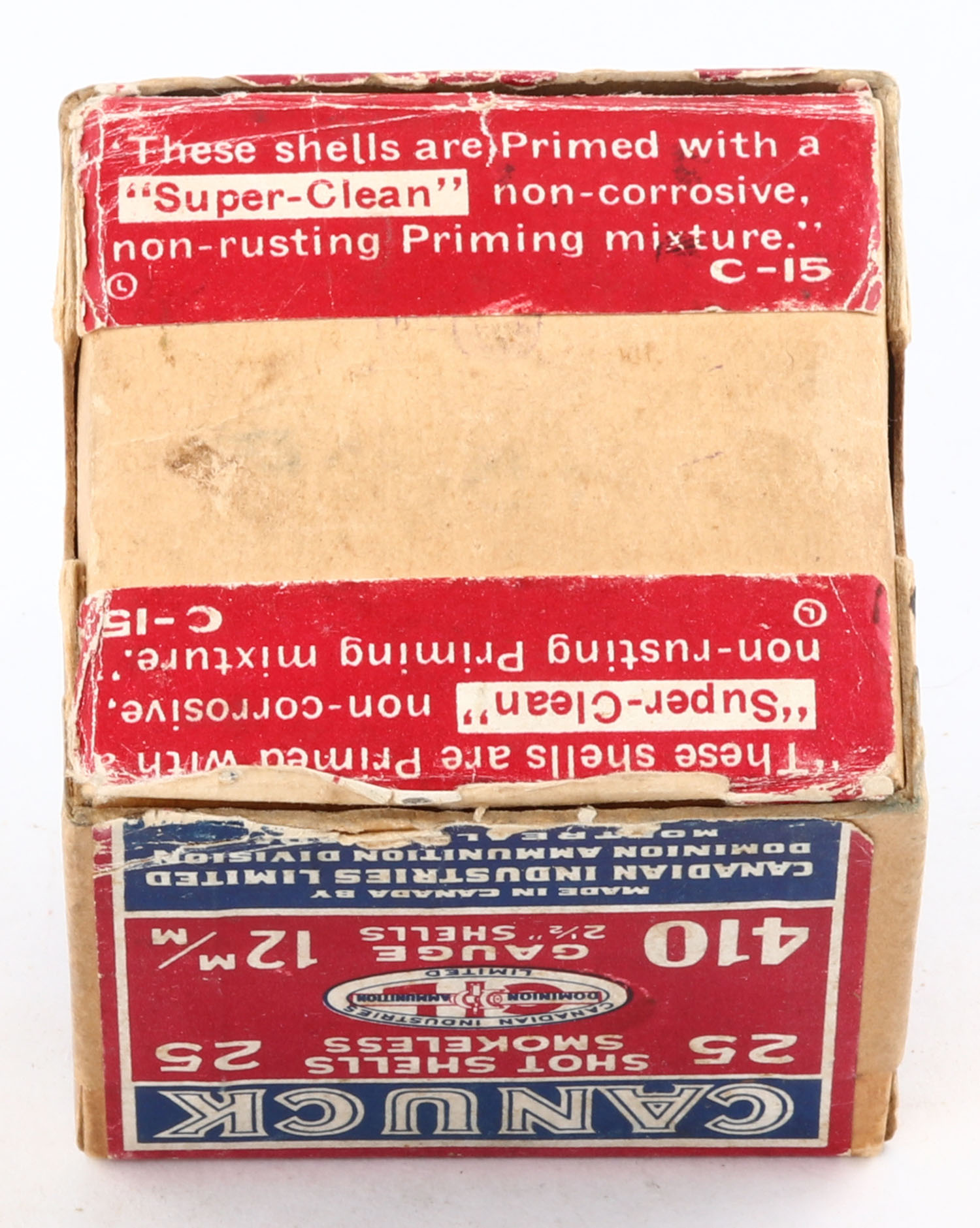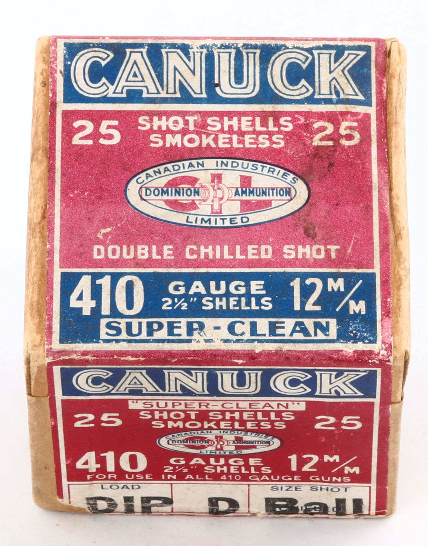 CIL, CANUCK, 410ga., 2pc., Empty, shot size Ball, multi-colored box, box has age soiling & scuffing with edge wear. Grade: Very Good - Value: 20 to 100
