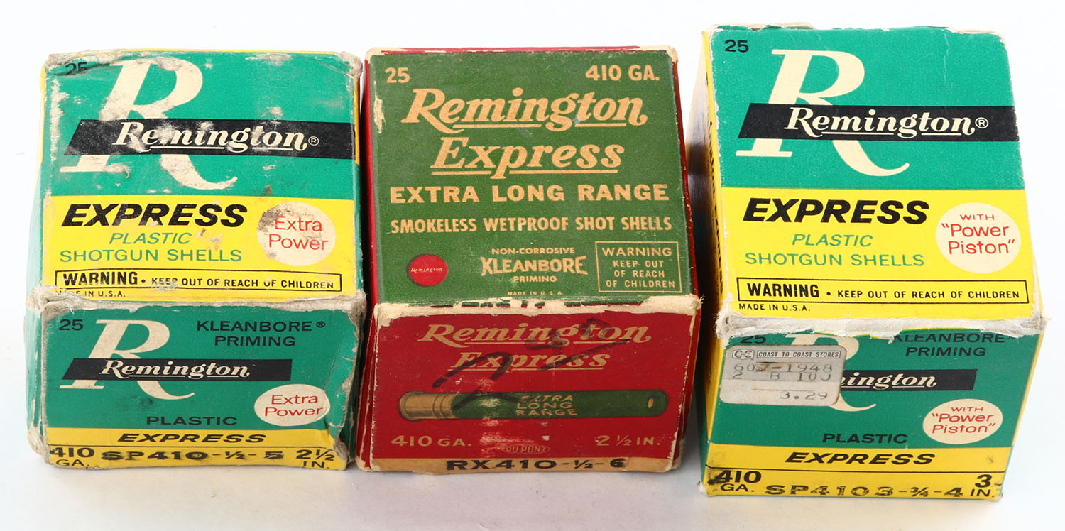 Lot of 3 Remington, 410ga., 1pc., Appears Partial, shot size 4, 5 and 6, multi-colored boxes. Grade: Good - Value: 10 to 40