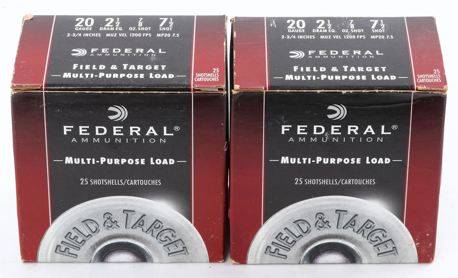 Lot of 2 Federal, 20ga., 1pc., Appears Full, shot size 7 1/2, multi-colored box. Grade: Excellent - Value: 10 to 30