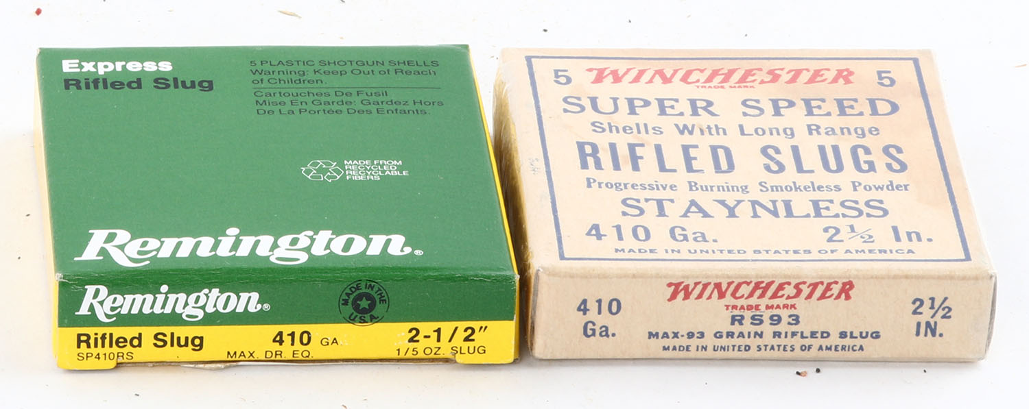 Lot of 2, Mixed Manufacture , 410ga., Appears Full, shot size Rifled Slugs, 2 1/2'', Shotshell boxes. Grade: Excellent - Value: 10 to 40